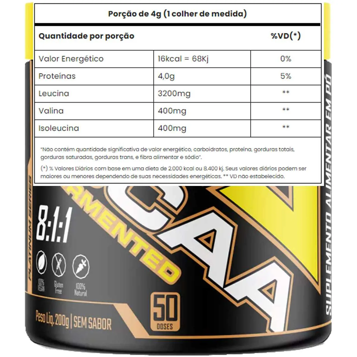 Misture meia colher medida (4g) de BCAA Fermentado 8:1:1 a um copo de água ou sua bebida preferida. Ingredientes