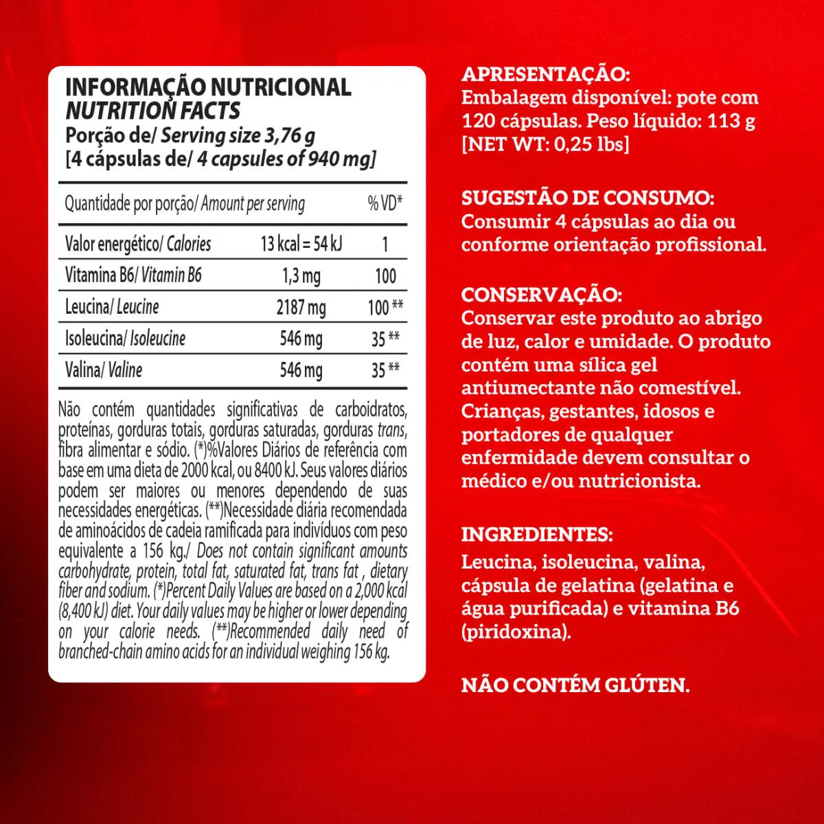 Um forte aliado no ganho de massa muscular, esse suplemento é composto pelos 3 aminoácidos essenciais: leucina, Isoleucina e valina. Também conta com a adição de vitamina B6, que melhora a absorção dos aminoácidos pelas células.