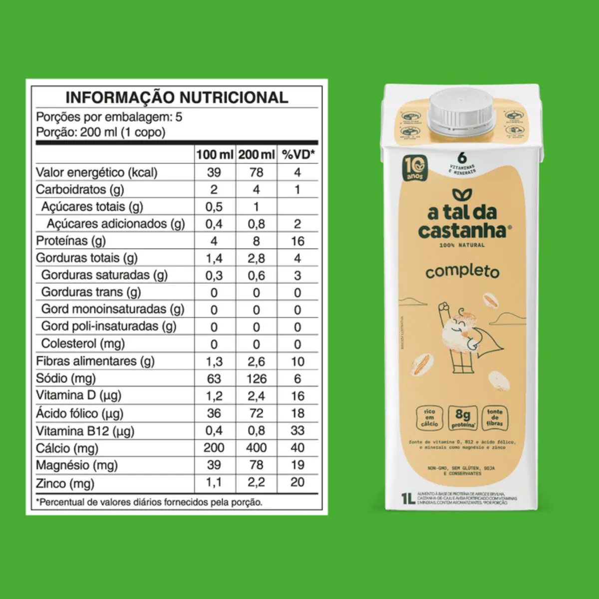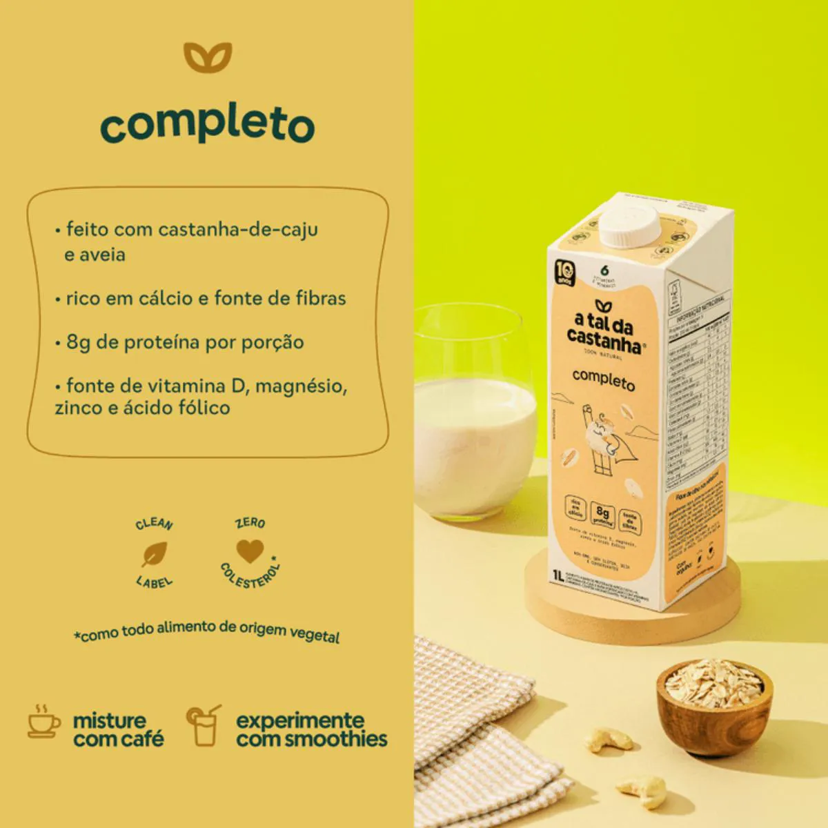 O Completo é uma bebida vegetal desenvolvida para oferecer nutrição prática e completa em qualquer momento do dia. Feito com proteína de arroz e ervilha, castanha-de-caju e aveia sem glúten, é fortificado com cálcio, magnésio, zinco, vitamina d, vitamina B12 e ácido fólico. Com 8g de proteína por porção, fibras alimentares e baixo teor de açúcares e gorduras, é 100% vegetal, sem lactose, sem glúten e sem colesterol, ideal para quem busca equilíbrio, sabor e versatilidade na rotina. Ingredientes: Água, proteína de arroz, castanha-de-caju, proteína de ervilha, farinha de aveia sem glúten, fosfato tricálcico (cálcio), sais de magnésio de ácido cítrico (magnésio), sal marinho, sulfato de zinco monoidratado (zinco), ergocalciferol (vitamina D2), cianocobalamina (vitamina B12), ácido N-pteroil-L-glutâmico (ácido fólico) e aromas naturais. ALÉRGICOS: CONTÉM CASTANHA-DE-CAJU. NÃO CONTÉM GLÚTEN. Agite bem antes de consumir. Beba puro ou use como base em receitas, vitaminas, cafés ou shakes. Pode ser consumido quente ou frio, conforme sua preferência.