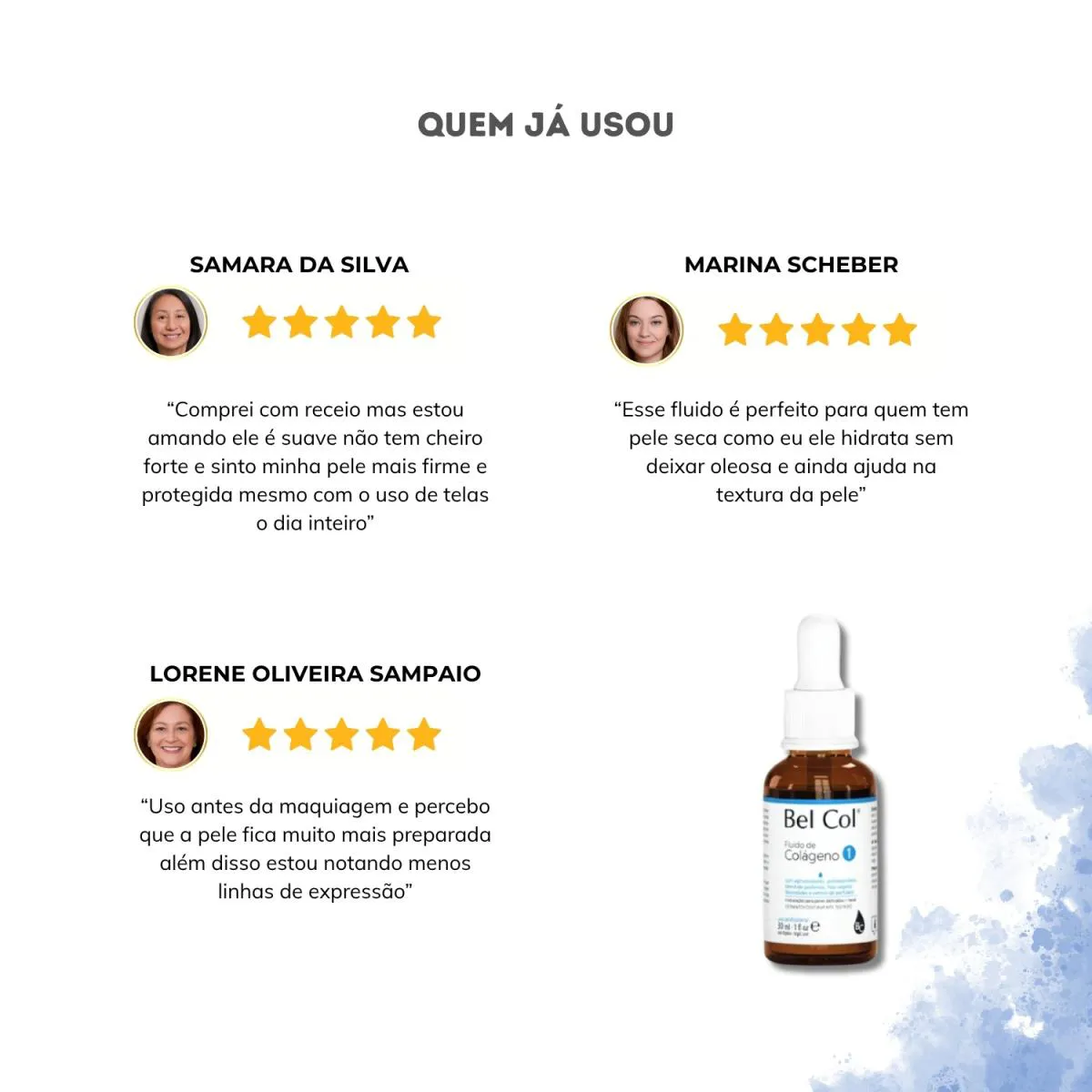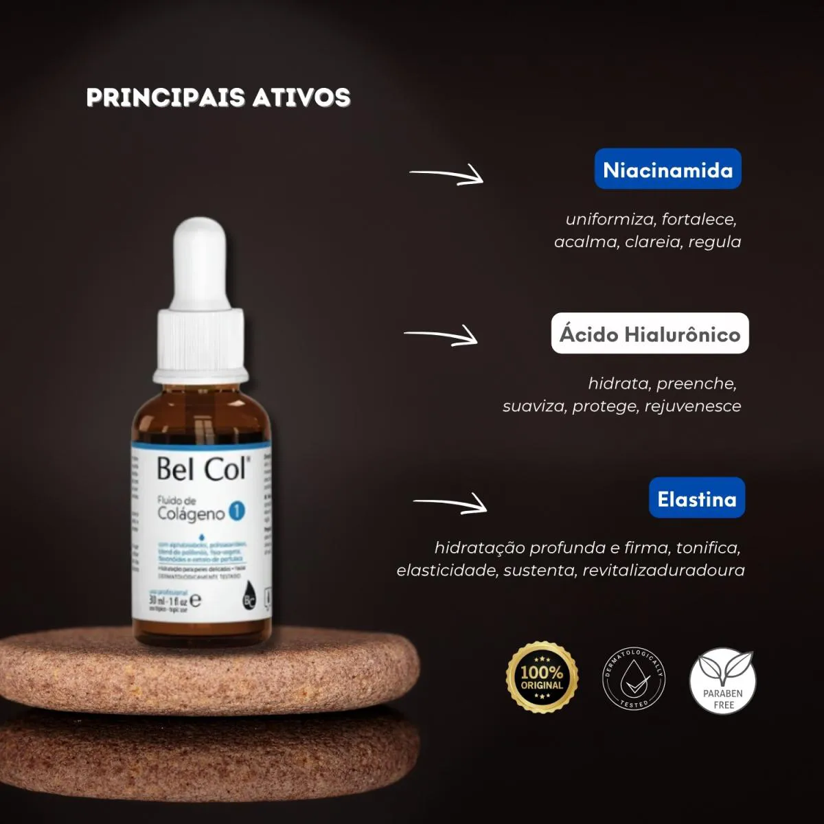 colágeno hidrolisado que melhora a sustentação e elasticidade da pele Ácido Hialurônico que hidrata profundamente e suaviza linhas Niacinamida que uniformiza o tom e fortalece a barreira cutânea Elastina que tonifica e promove firmeza extrato de camomila e alpha bisabolol que acalmam e suavizam MODO DE USO