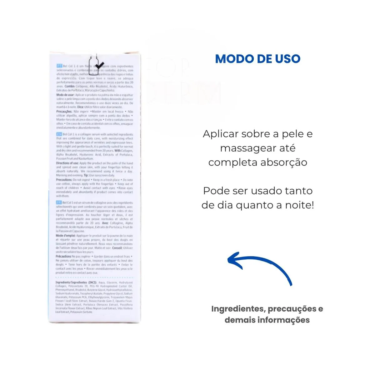 Aplicar algumas gotas na palma da mão e espalhar sobre a pele limpa do rosto pescoço e colo massageando até completa absorção pode ser usado de manhã e à noite ou conforme orientação profissional