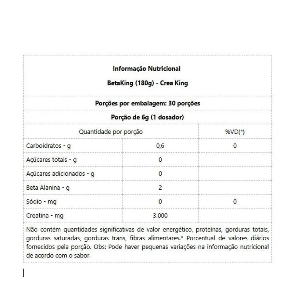 BETAKING (180g) - Crea King Descubra o poder de BETAKING da Crea King, a combinação perfeita de Creatina e Beta-Alanina para quem busca o máximo desempenho nos treinos. Com uma fórmula exclusiva e cientificamente balanceada, BETAKING oferece 3g de creatina e 2g de beta-alanina por dose de 6g, potencializando força, explosão muscular e resistência. Principais Benefícios: Mais Força e Explosão Muscular: A creatina é um dos suplementos mais estudados e comprovados no mercado esportivo, conhecida por melhorar a performance em atividades de alta intensidade e curta duração.Aumento da Resistência Muscular: A beta-alanina auxilia na redução da fadiga, ajudando a prolongar a intensidade dos exercícios e retardando a sensação de cansaço muscular.Recuperação Acelerada: Combinados, esses ativos auxiliam no suporte da recuperação muscular, permitindo treinos mais intensos e consistentes. Indicação de Uso: Ideal para atletas, praticantes de musculação e esportes de alta intensidade que buscam otimizar sua performance e superar seus limites. BETAKING é o suplemento para quem está determinado a conquistar mais a cada treino.