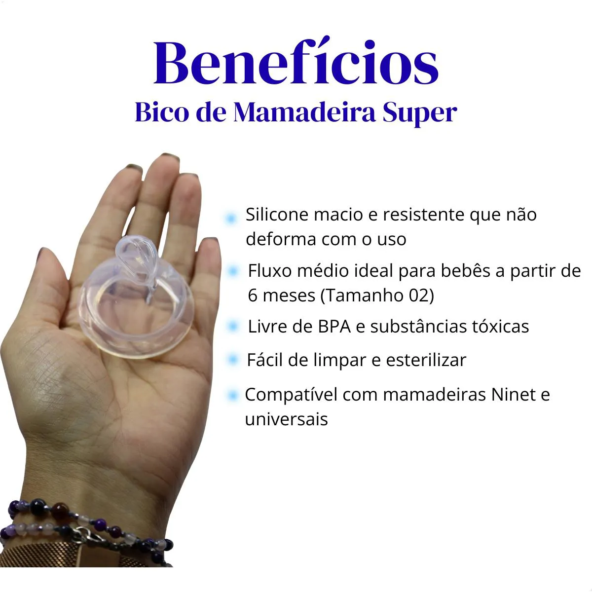 LOJA OFICIAL BELEZA MARCANTE cosméticos A Beleza Marcante Cosméticos é uma loja virtual que, há mais de 8 anos, cuida com carinho de pessoas modernas e atualizadas. Com um olhar atento, buscamos oferecer produtos inovadores que realçam a beleza natural e promovem o bem-estar. ESTOQUE DISPONÍVEL – ENVIO IMEDIATO APÓS CONFIRMAÇÃO DA COMPRA – ENVIAMOS PARA TODO O BRASIL – COM NOTA FISCAL – TODAS AS FOTOS SÃO REAIS – DIRETO DA FÁBRICA. Loja Oficial nas principais plataformas Mais de 8 anos entre os melhores vendedores nos marketplaces Variedade completa de produtos de qualidade Atendimento humanizado e especializado Fotos reais dos produtos Compras 100% seguras ESTE ANÚNCIO CONTÉM: 1 unidade de bico de mamadeira Assimétrico Ninet Tamanho 2 – 100% Silicone O Bico de Mamadeira Super Ninet é a escolha ideal para o bebê a partir dos 6 meses, oferecendo um fluxo médio (Tamanho 02) ideal para esta fase de desenvolvimento. Desenvolvido em 100% silicone macio e resistente, ele foi projetado para não deformar com o uso frequente e garantir uma alimentação contínua e confortável. Com formato assimétrico, o bico se adapta perfeitamente à boca do bebê, simulando o formato do seio materno e facilitando a transição entre o peito e a mamadeira. É um produto totalmente Livre de BPA e substâncias tóxicas, promovendo segurança total para a saúde do seu filho. Além disso, é fácil de limpar e esterilizar, e sua compatibilidade se estende a mamadeiras Ninet e universais, oferecendo praticidade para os pais. CARACTERÍSTICAS DO PRODUTO: Material: 100% Silicone macio e resistente. Não deforma com o uso e é durável. Tipo de Fluxo: Fluxo Médio (Tamanho 02). Idade Recomendada: Bebês a partir de 6 meses. Formato: Assimétrico, imitando o seio materno. Livre de BPA e substâncias tóxicas. Fácil de limpar e esterilizar. Compatibilidade com mamadeiras Ninet e universais. Contém 1 unidade. BENEFÍCIOS DO PRODUTO: Promove uma pega natural graças ao formato assimétrico. Fluxo ideal para a fase de alimentação do bebê (6 meses+). Material saudável e seguro (BPA Free). Alta durabilidade, pois o silicone não deforma. Versátil e fácil de usar em diferentes mamadeiras. RECOMENDAÇÕES DE USO E HIGIENE: Antes de cada uso, examine o bico, descartando-o ao primeiro sinal de desgaste ou rachaduras. Lave e esterilize antes do primeiro uso e após cada utilização. É fácil de esterilizar por fervura ou em esterilizadores a vapor. Armazene em local seco e coberto, longe da luz solar direta. Não utilize o bico como chupeta ou mordedor. Substitua o bico conforme a recomendação do fabricante ou sinais de uso. PERGUNTAS FREQUENTES (FAQ) 1. Qual o tamanho e o fluxo deste bico? É o Tamanho 02, com fluxo médio, ideal para bebês a partir de 6 meses. 2. Ele se encaixa em qualquer mamadeira? Ele é compatível com mamadeiras Ninet e também com a maioria das mamadeiras de rosca universal. 3. O material é seguro para o bebê? Sim. É feito de 100% silicone, sendo Livre de BPA e substâncias tóxicas. 4. O bico deforma com a sucção? Não. O silicone é macio, mas resistente, projetado para manter a forma com o uso. 5. De quanto em quanto tempo devo trocar o bico? Recomenda-se a substituição a cada 30 a 45 dias, dependendo da frequência de uso e dos sinais de desgaste. ATENÇÃO! Não aceitamos devoluções de produtos usados. Pedimos, por gentileza, que verifique todas as informações antes de finalizar sua compra. Estamos à disposição para esclarecer qualquer dúvida na área de perguntas do anúncio. Será um prazer atendê-lo(a)! BELEZA MARCANTE COSMÉTICOS.