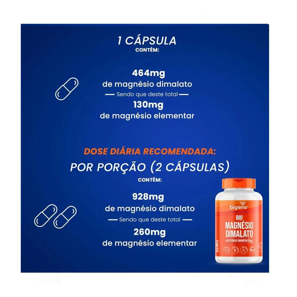 Ingredientes: Dimagnésio malato, estabilizantes celulose microcristalina e amido, antiumectante dióxido de silício e fosfato tricálcico. INGREDIENTES DA CÁPSULA: Celulose e água potável filtrada. NÃO CONTÉM GLÚTEN. Sugestões de uso: Ingerir 2 cápsulas ao dia. Cuidados de conservação: CONSERVE AO ABRIGO DA LUZ, CALOR E UMIDADE. MANTER O FRASCO HERMETICAMENTE FECHADO. APÓS ABERTO CONSUMIR EM ATÉ 90 DIAS. Atenção: Produto indicado para o grupo populacional ≥ 19 anos. Este produto não é um medicamento. Não exceder a recomendação diária de consumo indicada na embalagem. Mantenha fora do alcance de crianças. Suplemento Alimentar dispensado de registro conforme Resolução RDC nº 240/2018.