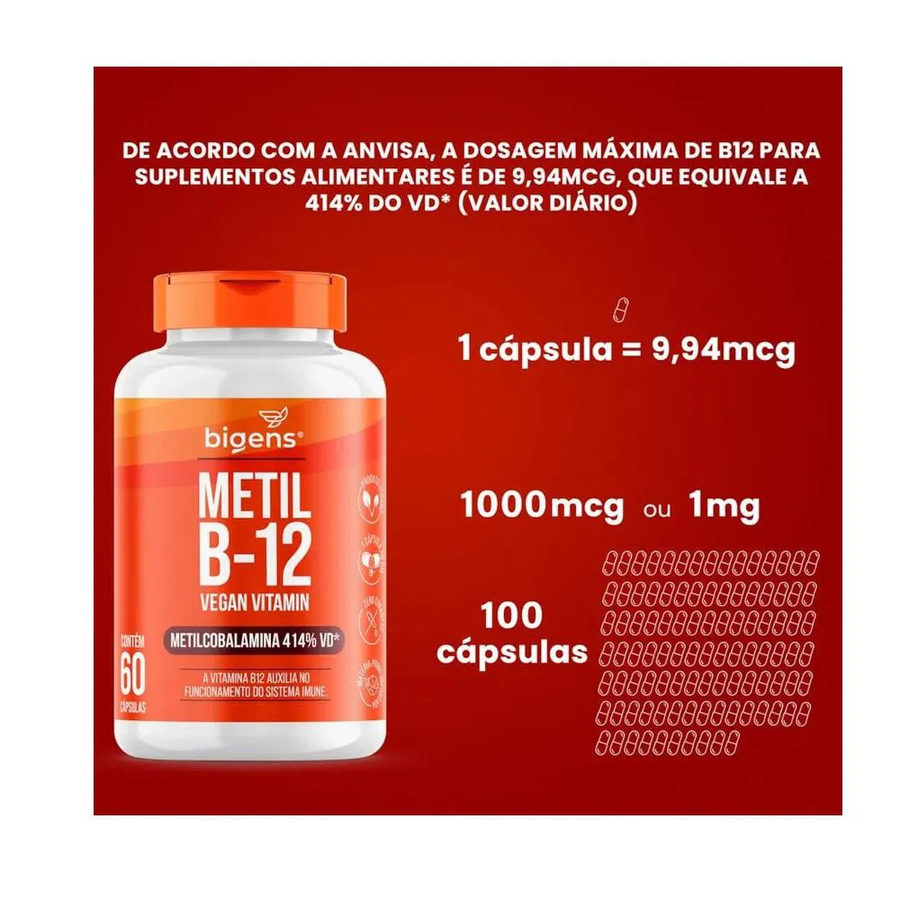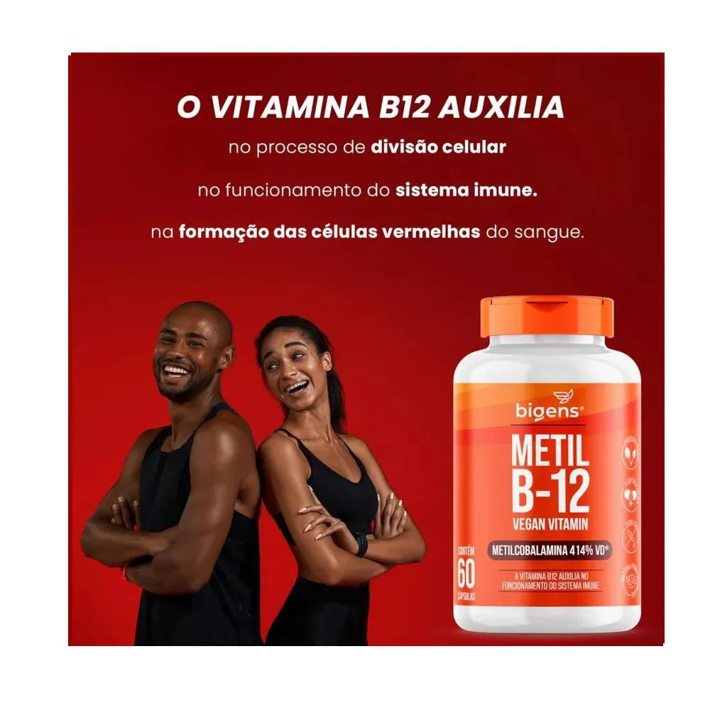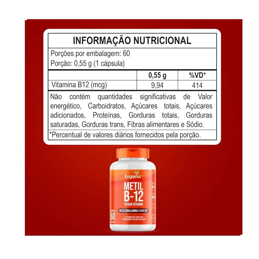 Ingredientes: Metilcobalamina, estabilizantes celulose microcristalina e amido, antiumectante dióxido de silício. INGREDIENTES DA CÁPSULA: Celulose e água potável filtrada. NÃO CONTÉM GLÚTEN. Sugestões de uso: Ingerir 1 cápsula ao dia. Cuidados de conservação: CONSERVE AO ABRIGO DA LUZ, CALOR E UMIDADE. MANTER O FRASCO HERMETICAMENTE FECHADO. APÓS ABERTO CONSUMIR EM ATÉ 90 DIAS. Atenção: Produto indicado para o grupo populacional ≥ 19 anos. Este produto não é um medicamento. Não exceder a recomendação diária de consumo indicada na embalagem. Mantenha fora do alcance de crianças. Suplemento Alimentar dispensado de registro conforme Resolução RDC nº 240/2018.
