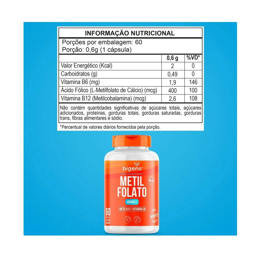 Ingredientes: Cloridrato piridoxina (Vitamina B6), L-Metilfolato de Cálcio (Ácido Fólico), Metilcobalamina (Vitamina B12), estabilizante celulose microcristalina e amido, antiumectante dióxido de silício. INGREDIENTES DA CÁPSULA: Celulose e água potável filtrada. NÃO CONTÉM GLÚTEN. Sugestões de uso: Ingerir 1 cápsula 1 vez ao dia. Cuidados de conservação: CONSERVE AO ABRIGO DA LUZ, CALOR E UMIDADE. MANTER O FRASCO HERMETICAMENTE FECHADO. APÓS ABERTO CONSUMIR EM ATÉ 90 DIAS. Atenção: Produto indicado para o grupo populacional ≥ 19 anos. Este produto não é um medicamento. Não exceder a recomendação diária de consumo indicada na embalagem. Mantenha fora do alcance de crianças. Suplemento Alimentar dispensado de registro conforme Resolução RDC nº 240/2018.