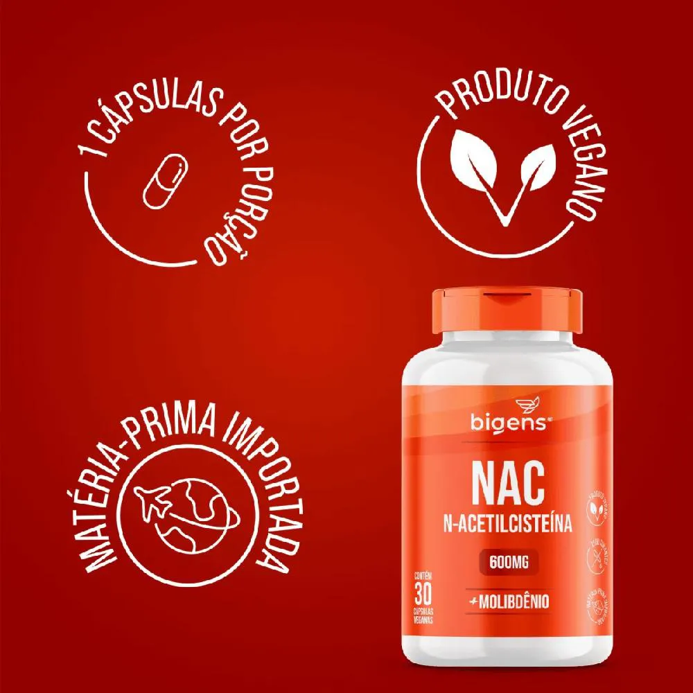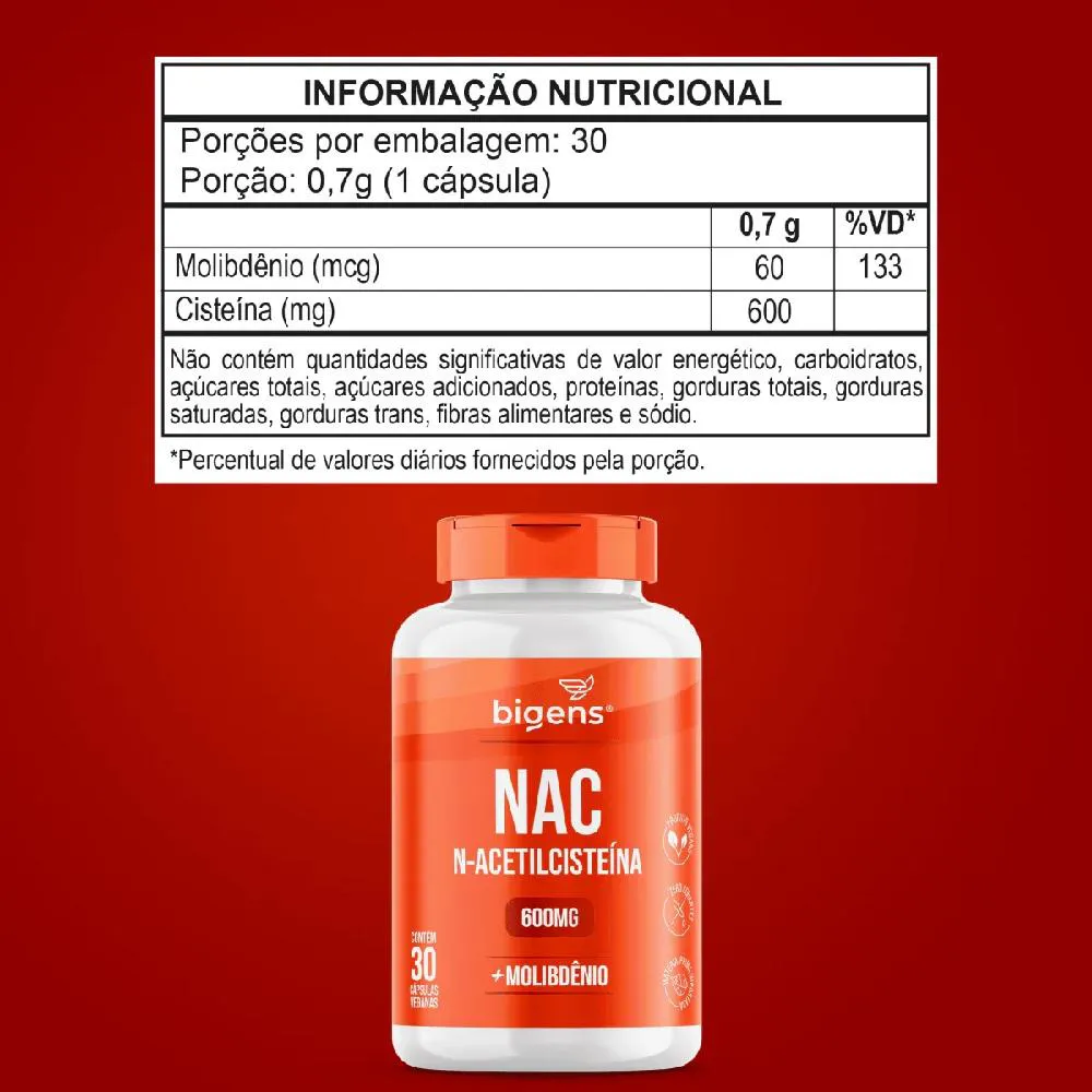 N-acetilcisteína ou NAC é a forma biodisponível do aminoácido cisteína, no organismo humano este micronutriente se converte na enzima glutationa (GSH) - um dos mais essenciais para o bom funcionamento do organismo. O molibdênio auxilia no metabolismo dos aminoácidos sulfurados, que é o caso da cisteína. Ingredientes: N-Acetil L-cisteína, molibdato de sódio, estabilizantes celulose microcristalina e amido, antiumectante dióxido de silício e fosfato tricálcico. INGREDIENTES DA CÁPSULA: Celulose e água potável filtrada. NÃO CONTÉM GLÚTEN. Sugestões de uso: Ingerir 1 cápsula 1 vez ao dia ou conforme orientação médica/nutricionista. Cuidados de conservação: CONSERVE AO ABRIGO DA LUZ, CALOR E UMIDADE. MANTER O FRASCO HERMETICAMENTE FECHADO. APÓS ABERTO CONSUMIR EM ATÉ 90 DIAS. Atenção: Produto indicado para o grupo populacional maior de 19 anos. Este produto não é um medicamento. Não exceder a recomendação diária de consumo indicada na embalagem. Mantenha fora do alcance de crianças. Este produto não deve ser consumido por gestantes, lactantes e crianças. Suplemento Alimentar dispensado de registro conforme Resolução RDC nº 240/2018.