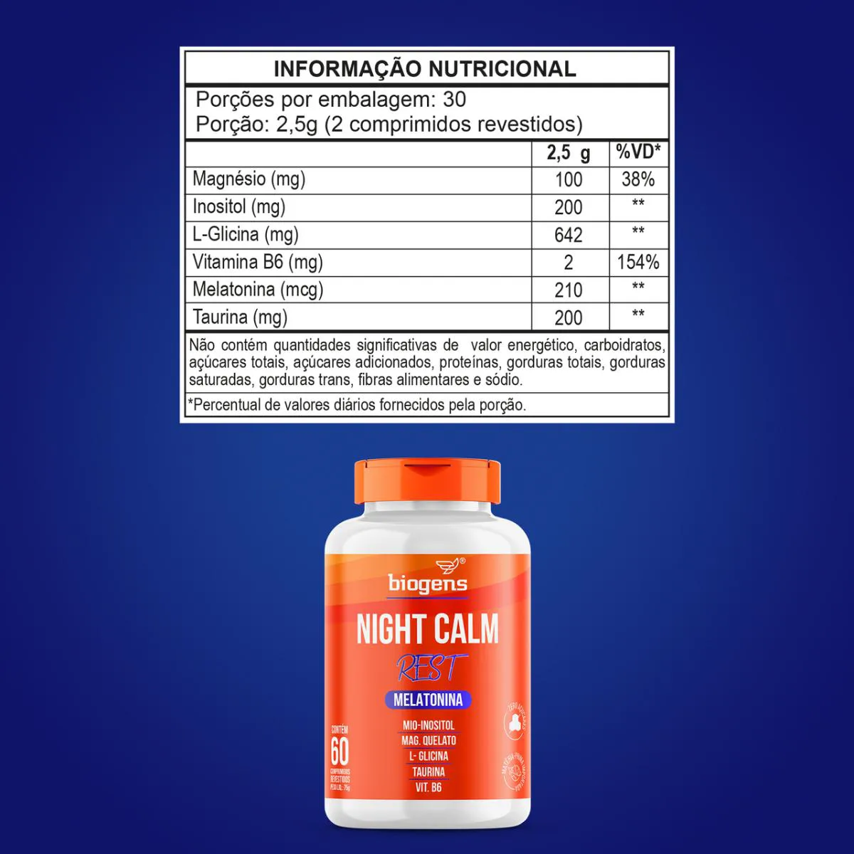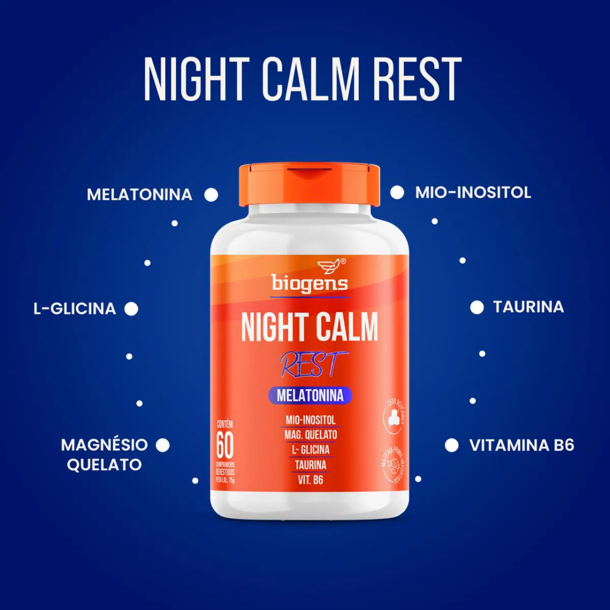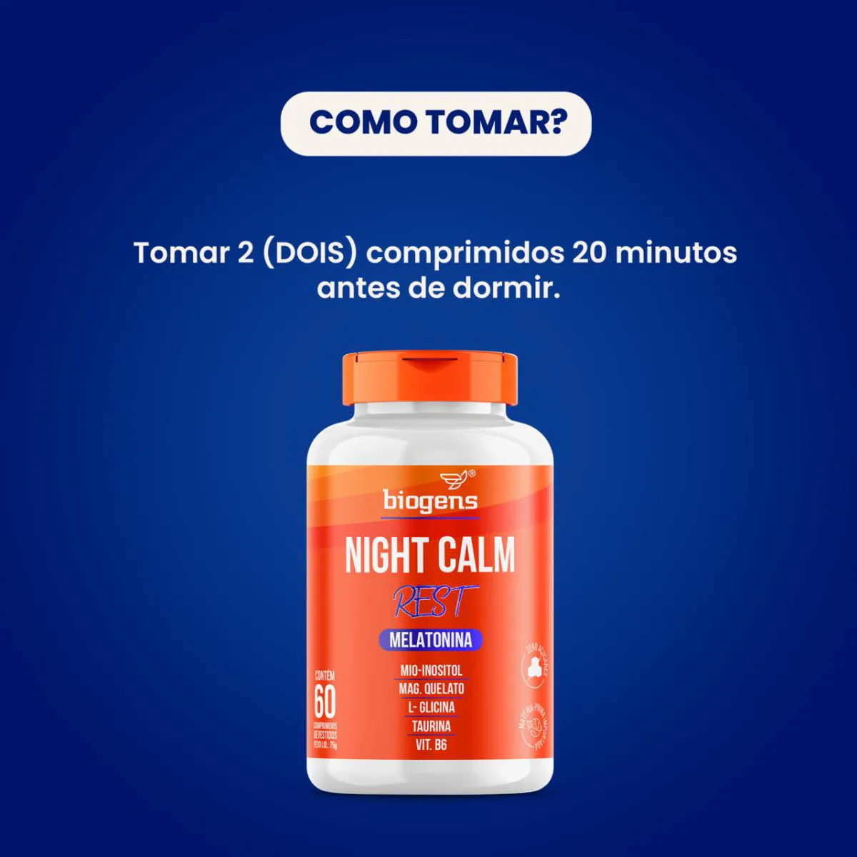 O Night Calm Rest da Bigens é composto por uma mistura de magnésio, Mio Inositol, Glicina e vitamina B6. A suplementação com o Night calm Rest (somado à fatores como alimentação saudável, prática de exercícios, hidratação e higiene do sono) pode contribuir com o relaxamento.