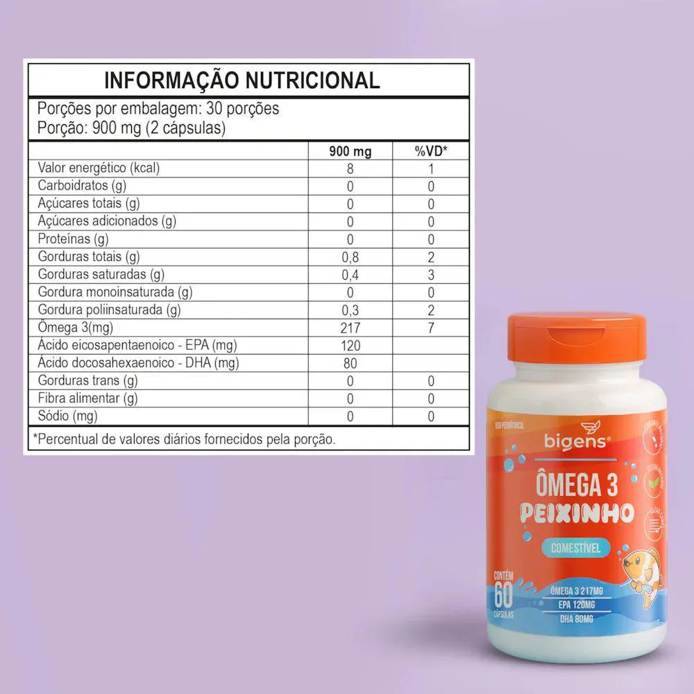 Ômega 3 Peixinho Bigens – Uso Pediátrico | 60 cápsulas comestíveis O Ômega 3 Peixinho da Bigens foi desenvolvido especialmente para o público infantil. Com cápsulas mastigáveis e comestíveis, é uma forma prática e agradável de incluir o ômega 3 na rotina das crianças. Cada porção (2 cápsulas) oferece 217mg de ômega 3, com 120mg de EPA e 80mg de DHA. Esses ácidos graxos são importantes para o desenvolvimento saudável, especialmente do cérebro e da visão. Sua fórmula é limpa, com corante natural (betacaroteno), sem açúcar e sem glúten. Contém óleo de peixe, óleo de coco, óleo de laranja e aroma de cranberry, com um sabor suave e agradável de laranja. • Sugestão de uso: crianças devem mastigar 2 cápsulas por dia, ou conforme recomendação de um profissional da saúde. Não é medicamento. Não exceder a recomendação diária.