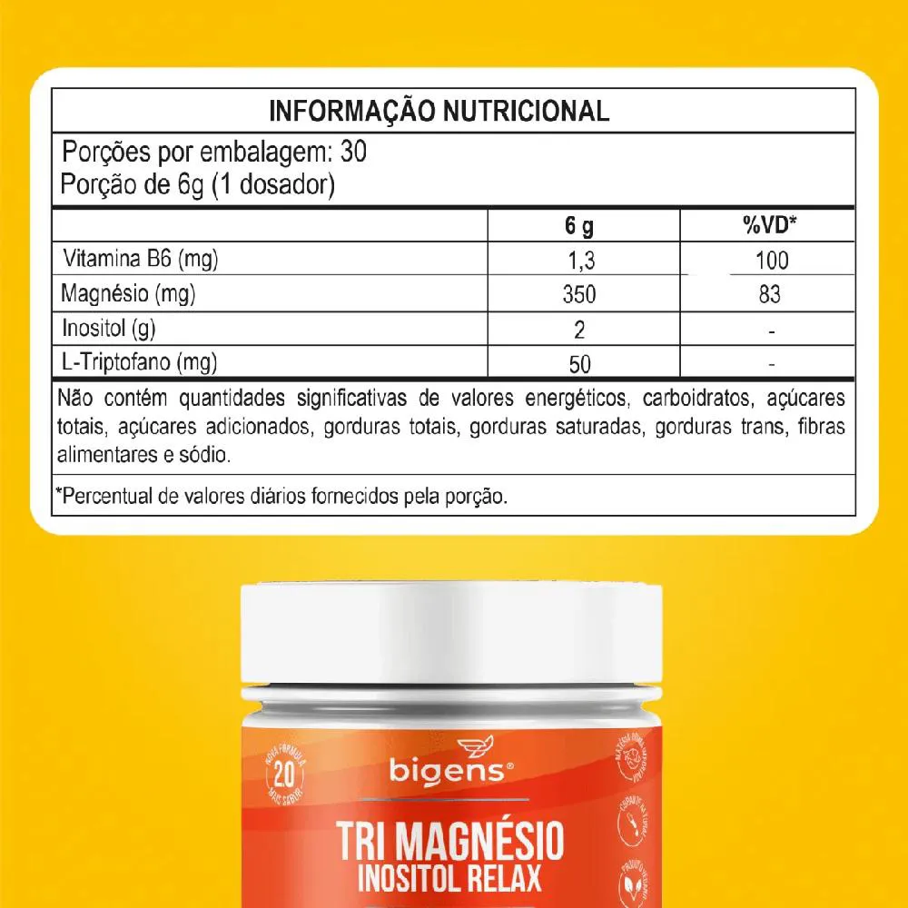 Ingredientes Inositol, bisglicinato de magnésio, malato de magnésio, maracujá em pó, taurato de magnésio, polidextrose, L-triptofano, extrato de rizomas de Curcuma longa, cloridrato de piridoxina (vitamina B6), acidulante ácido cítrico, aromatizante sintético idêntico ao natural, antiumectante dióxido de silício, edulcorante glicosídeos de esteviol e corante natural curcumina. NÃO CONTÉM GLÚTEN. Recomendação de uso: Adultos ≥ 19 anos, consumir 1 porção de 6g (1 medida dosadora) diluído em 150ml de água ou bebida de sua preferência, ou conforme a orientação de médico ou nutricionista. Produto dispensado de registro de acordo com Resolução RDC 240/2018.