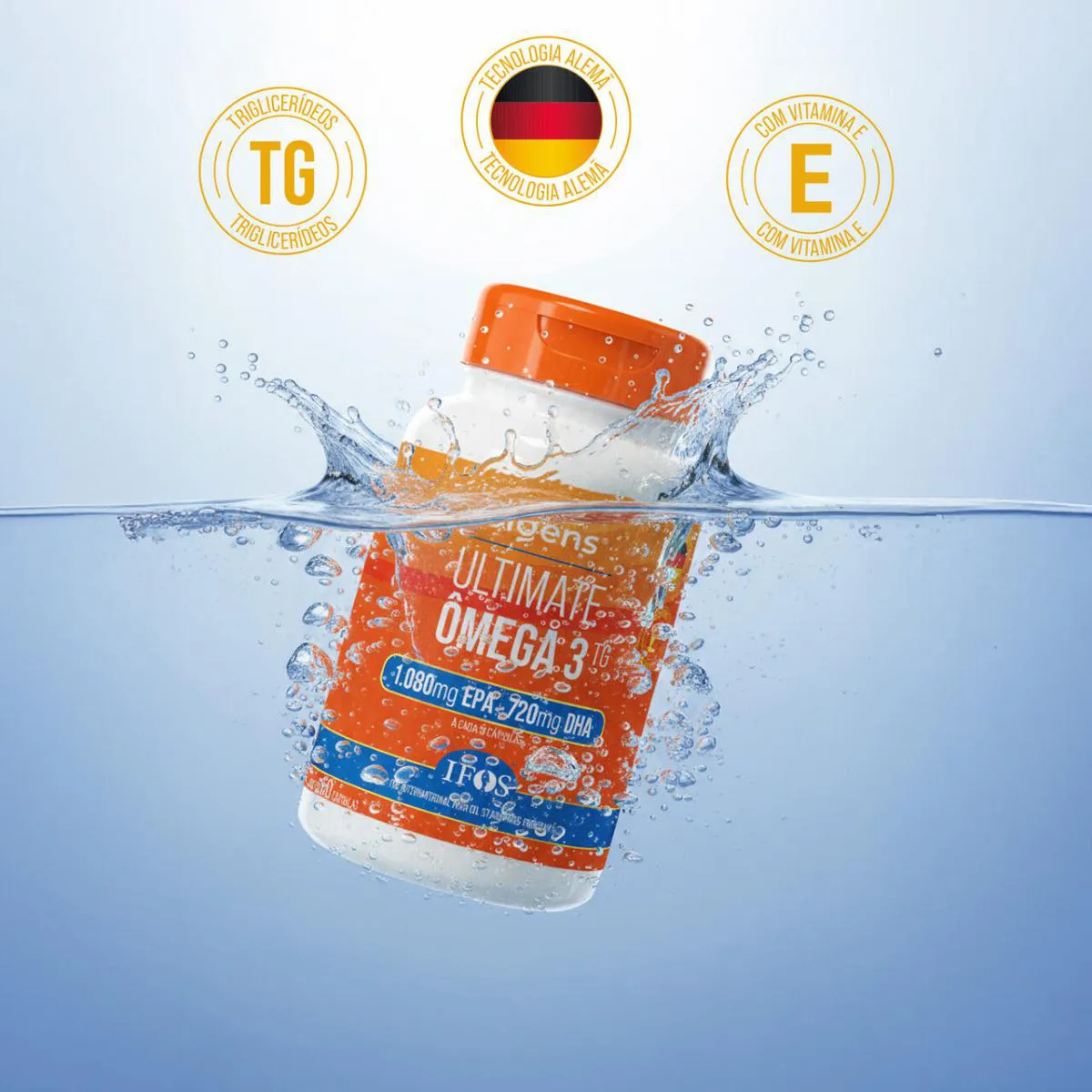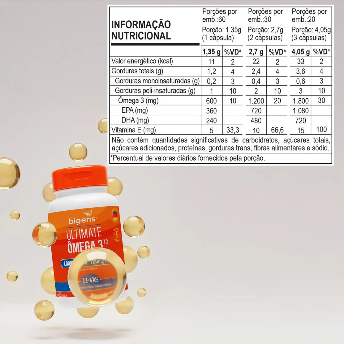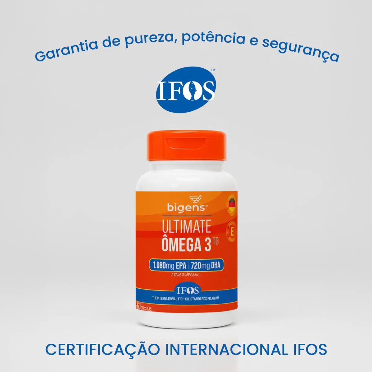 O Ultimate Ômega 3 TG Bigens é um suplemento alimentar em cápsulas de óleo de peixe, formulado na forma triglicerídeo (TG). Cada porção de 3 cápsulas fornece 1.080mg de EPA e 720mg de DHA, além de vitamina e. O produto possui o selo internacional IFOS, que atesta padrões de pureza e qualidade. Com tecnologia alemã e embalagem contendo 60 cápsulas, é uma opção prática para quem busca um suplemento de ômega 3 produzido com rigor e transparência.
