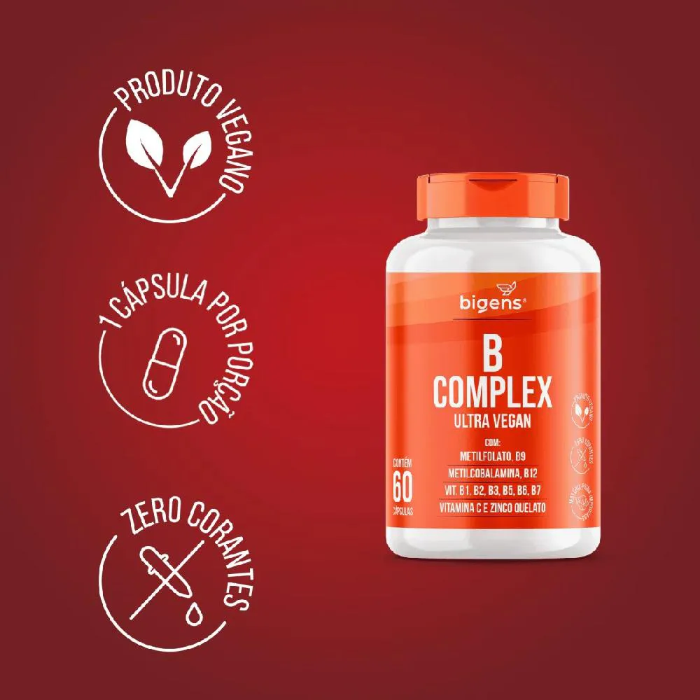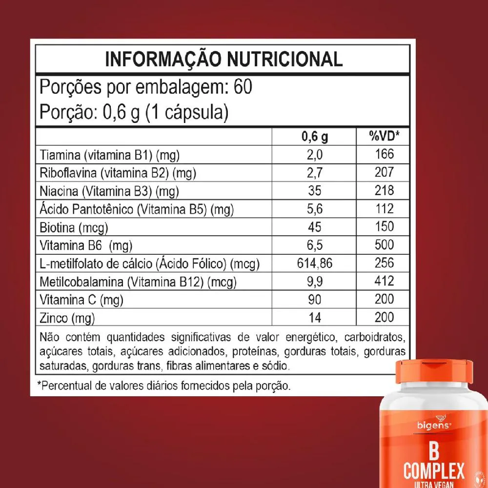 Ingredientes: Tiamina mononitrato (vitamina B1), riboflavina (vitamina B2), niacina (vitamina B3), D-pantotenato de cálcio (vitamina B5), biotina, L-metil folato de cálcio (ácido fólico), cloridrato piridoxina (vitamina B6), metilcobalamina (vitamina B12), ácido ascórbico (vitamina c), zinco quelato, estabilizantes celulose microcristalina e amido, antiumectante dióxido de silício. INGREDIENTES DA CÁPSULA: Celulose e água potável filtrada.“NÃO CONTÉM GLÚTEN”. Sugestões de uso: Ingerir 1 cápsula ao dia, ou a critério médico/nutricionista. Cuidados de conservação: Manter o frasco hermeticamente fechado. CONSERVE AO ABRIGO DA LUZ, CALOR E UMIDADE. APÓS ABERTO CONSUMIR EM ATÉ 90 DIAS. Atenção: PRODUTO INDICADO PARA O GRUPO POPULACIONAL ≥ 19 ANOS. Este produto não é um medicamento. Não exceder a recomendação diária de consumo indicada na embalagem. Mantenha fora do alcance de crianças. Não consumir este produto caso o lacre de segurança esteja violado. Suplemento Alimentar dispensado de registro conforme Resolução RDC nº 240/2018.