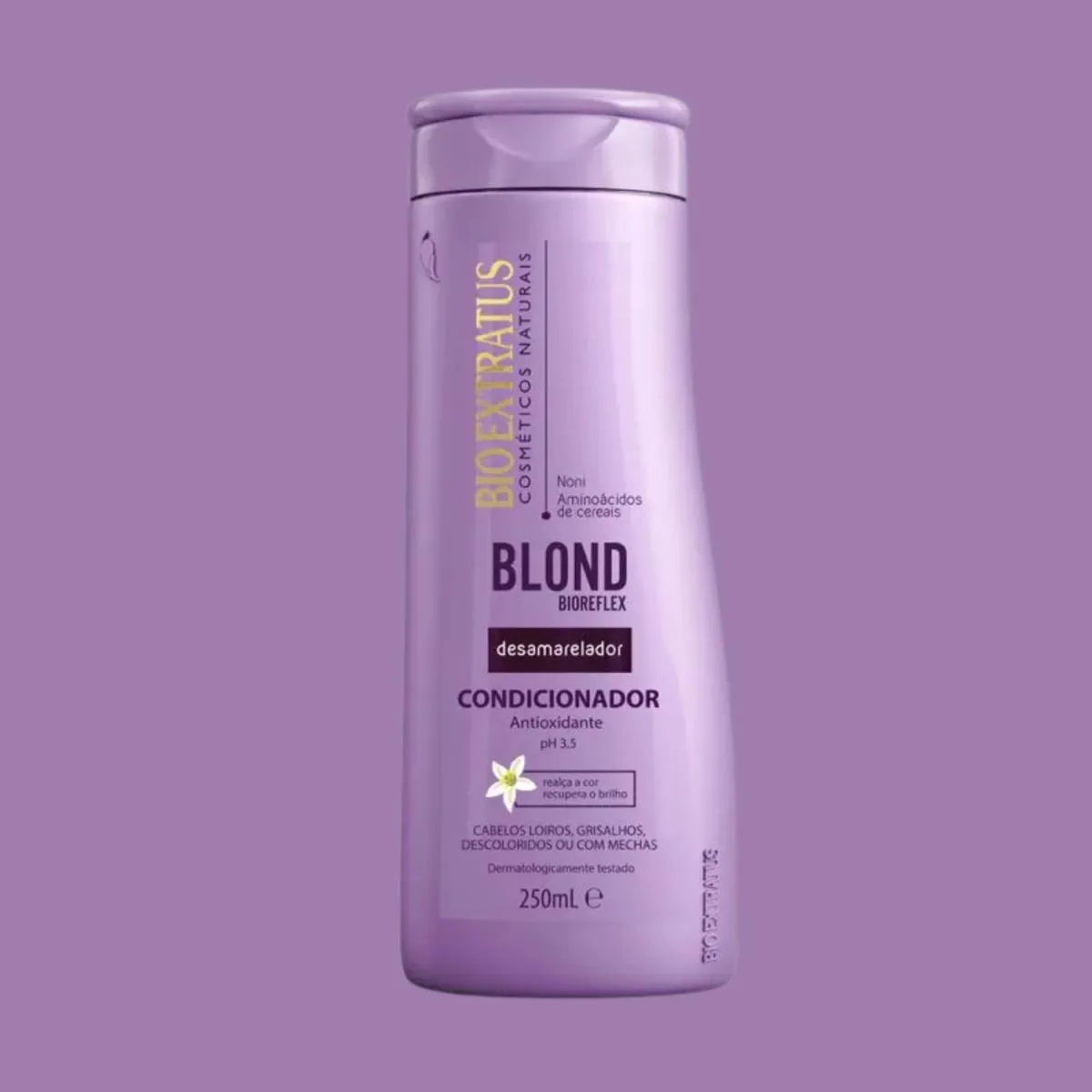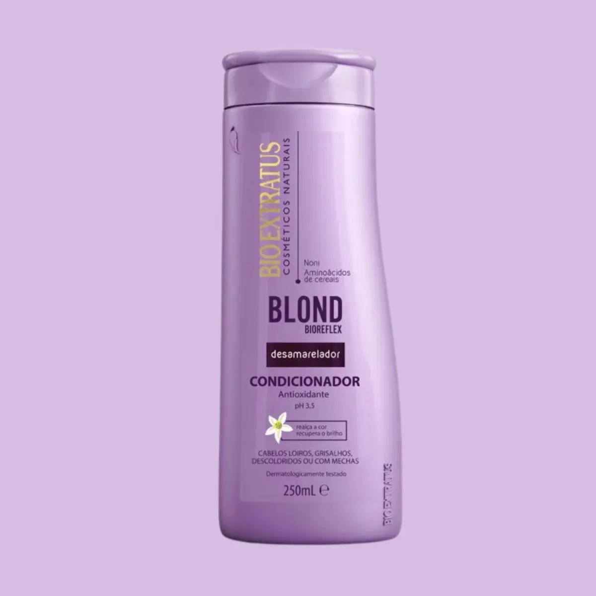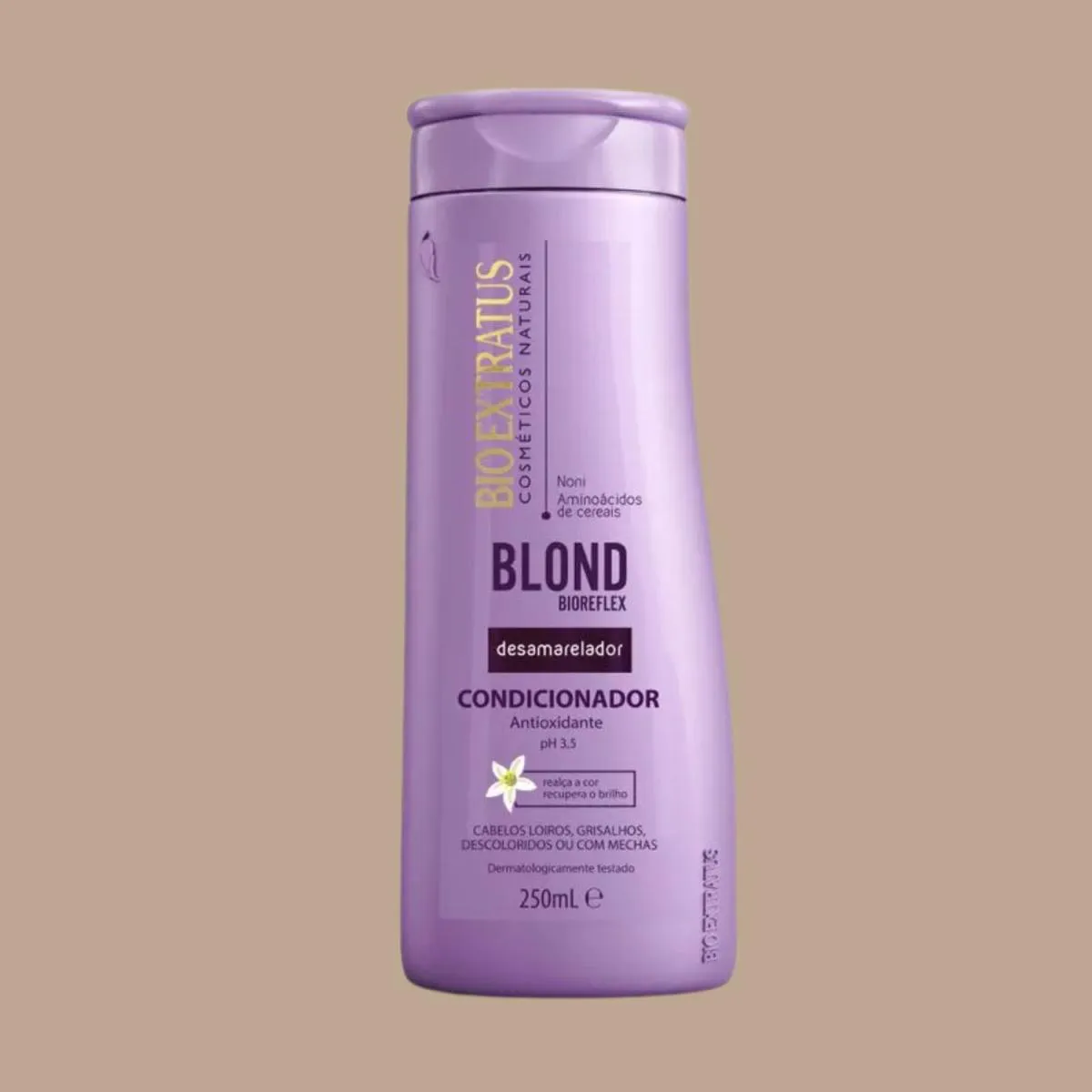 condicionador Bio Extratus Blond Desamarelador 250ml Cuidado diário para cabelos loiros, grisalhos ou descoloridos. O Condicionador Blond Desamarelador da Bio Extratus neutraliza tons amarelados indesejados enquanto hidrata e fortalece os fios. Sua fórmula combina extrato de noni, biotina, pantenol e pigmentos violetas, que promovem brilho, nutrição e ação antioxidante. Proporciona maciez, desembaraço e efeito iluminador sem ressecar os cabelos. Neutraliza o amarelado dos fios