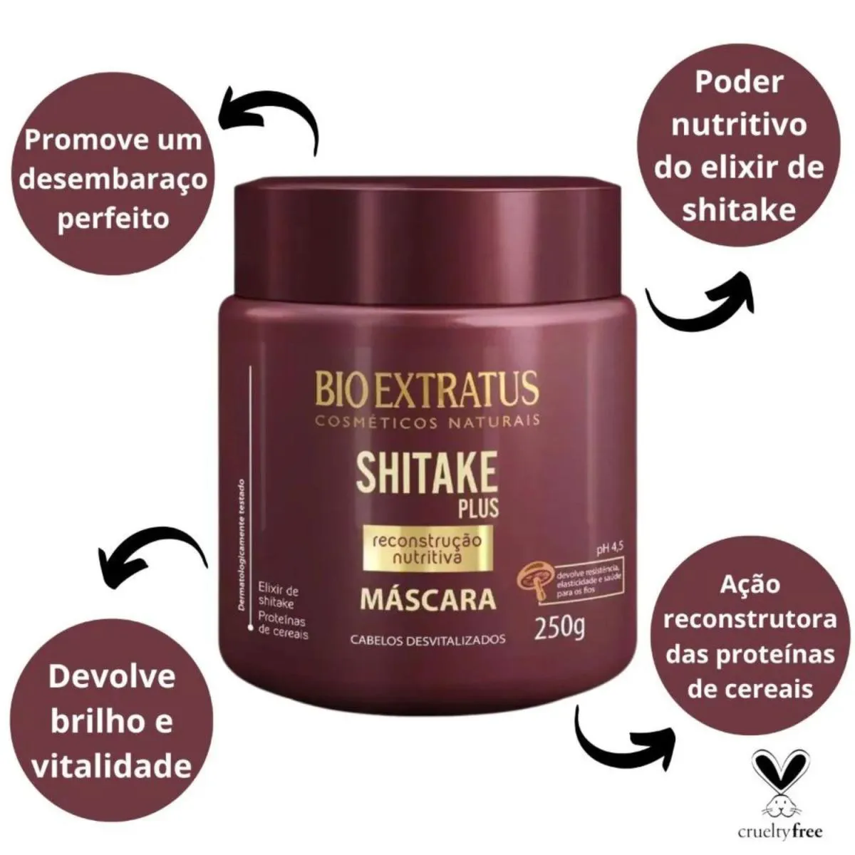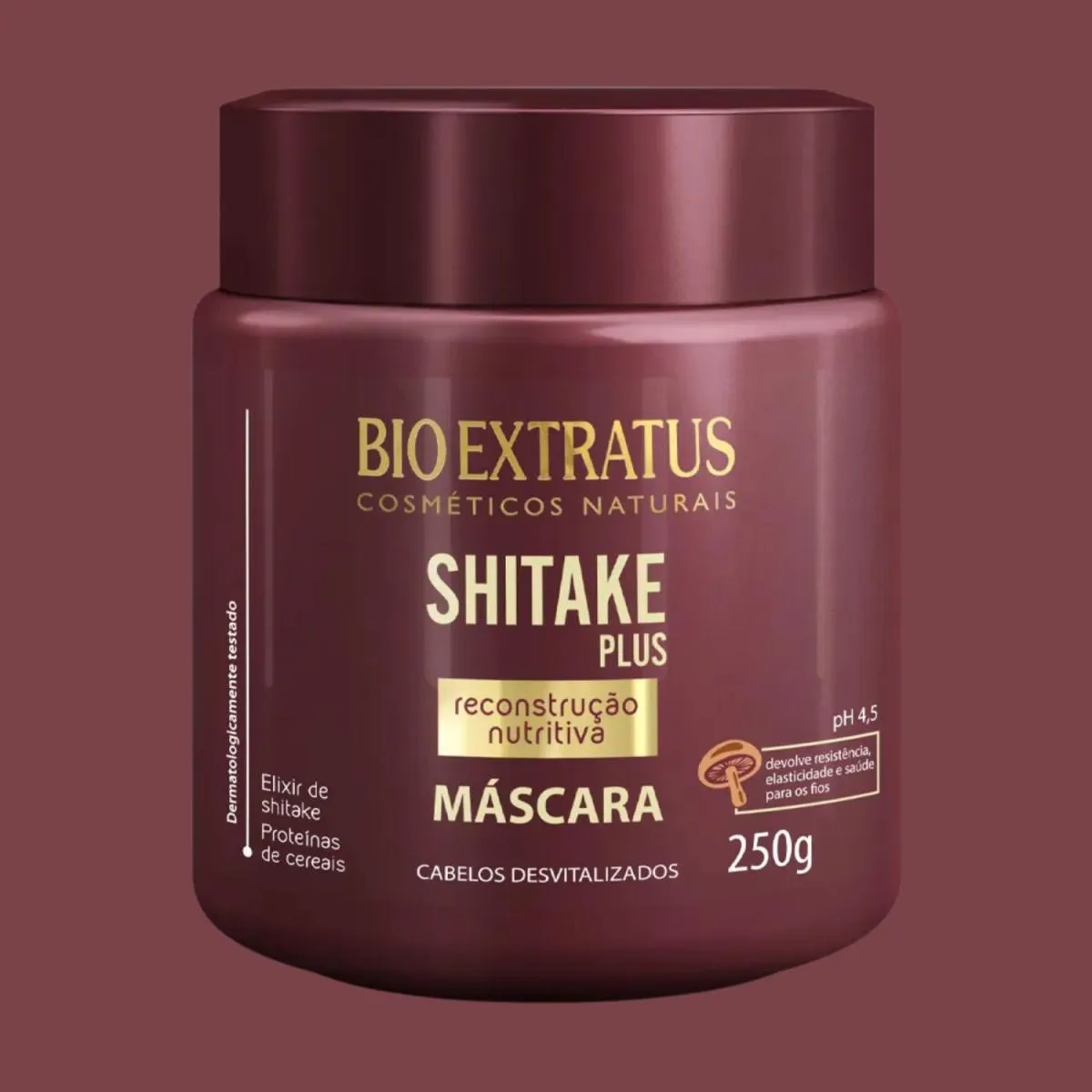 Tratamento intensivo para cabelos frágeis e danificados. A Máscara Shitake Plus da Bio Extratus combina o poder nutritivo do extrato de shitake com a ação reconstrutora das proteínas vegetais, promovendo uma restauração profunda da fibra capilar.