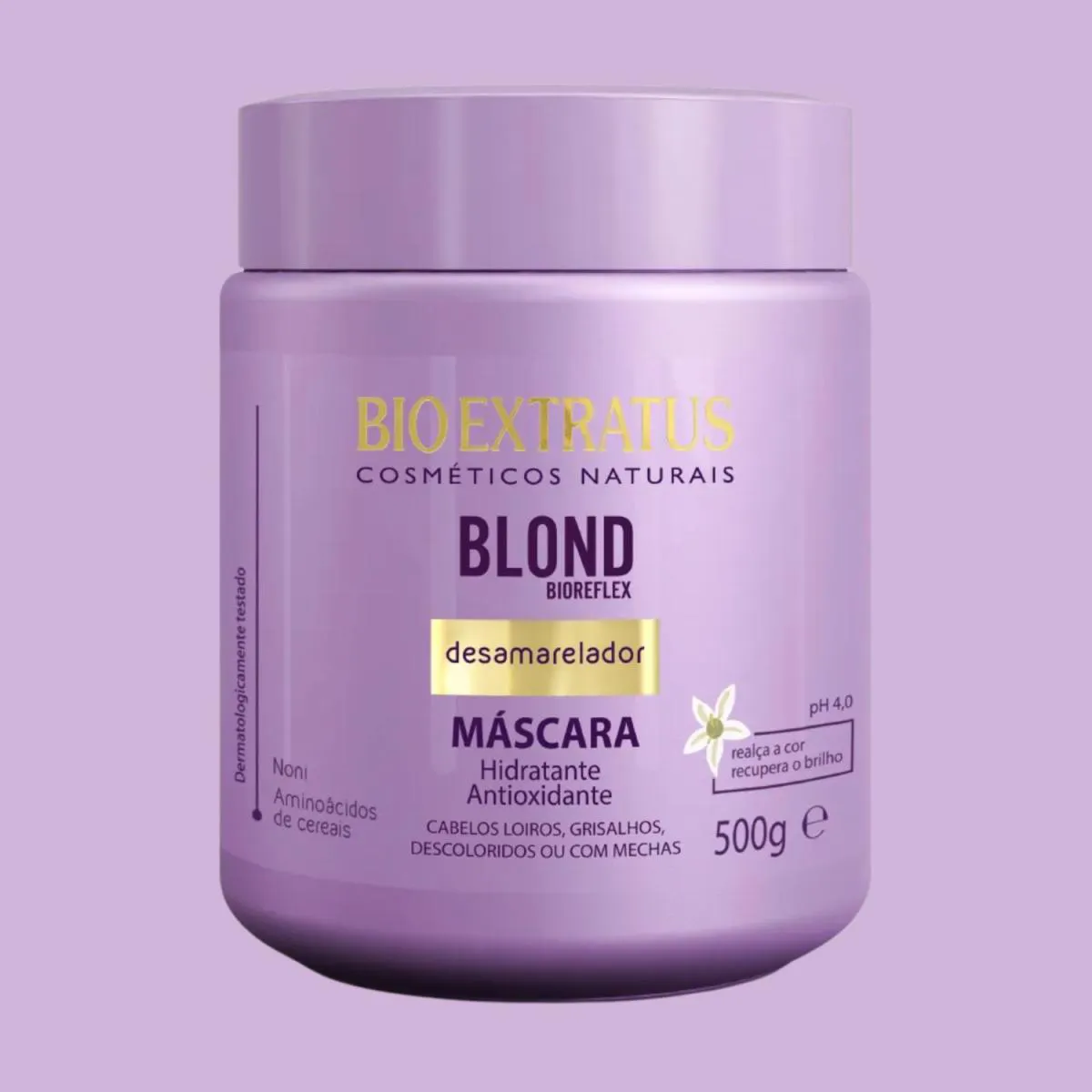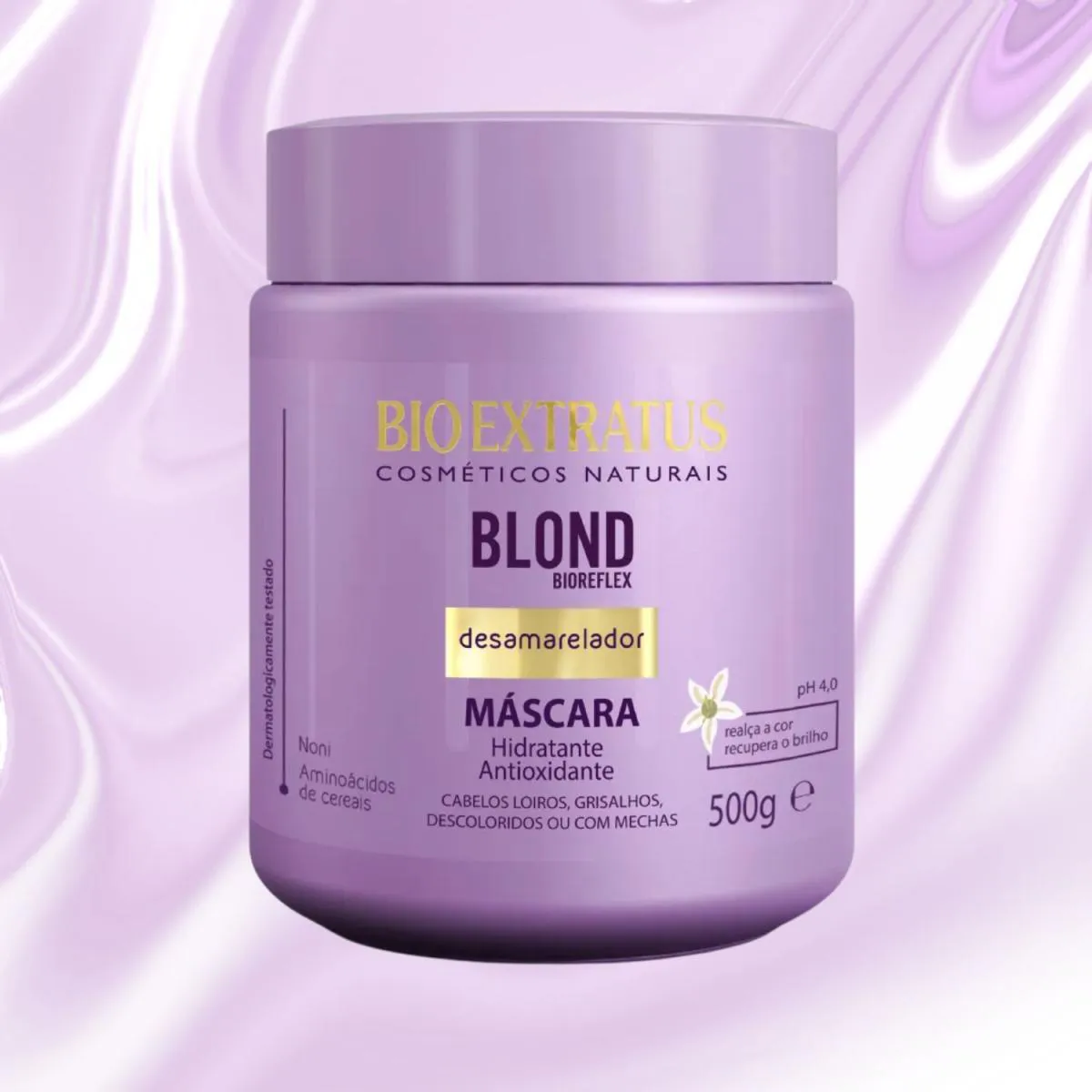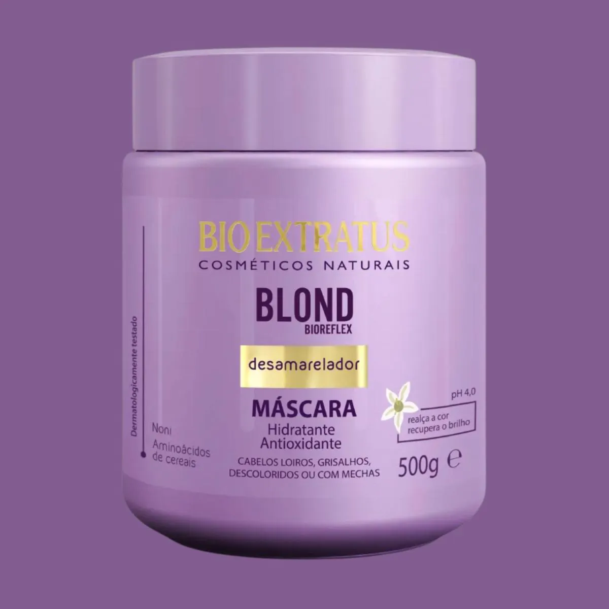 Máscara Blond Desamareladora hidratante 500g - Bio Extratus Luminosidade e cuidado para cabelos loiros, descoloridos ou grisalhos! A Máscara Bio Extratus Blond possui pigmento violeta que neutraliza os tons amarelados, promovendo brilho platinado e cor equilibrada, que tratam profundamente os fios, hidratam e restauram a estrutura capilar, deixando os cabelos mais saudáveis, macios e radiantes. Características: · Neutraliza o amarelado dos fios · Realça o tom platinado com brilho intenso · Hidrata e repara profundamente · Fórmula antioxidante e revitalizante · Ideal para uso semanal Modo de uso: Após lavar o cabelo, aplique a máscara nos fios úmidos, evitando a raiz. Deixe agir de 2 a 5 minutos, observando o tom desejado. Enxágue bem. Conteúdo: 500g