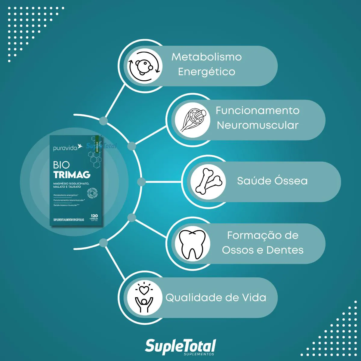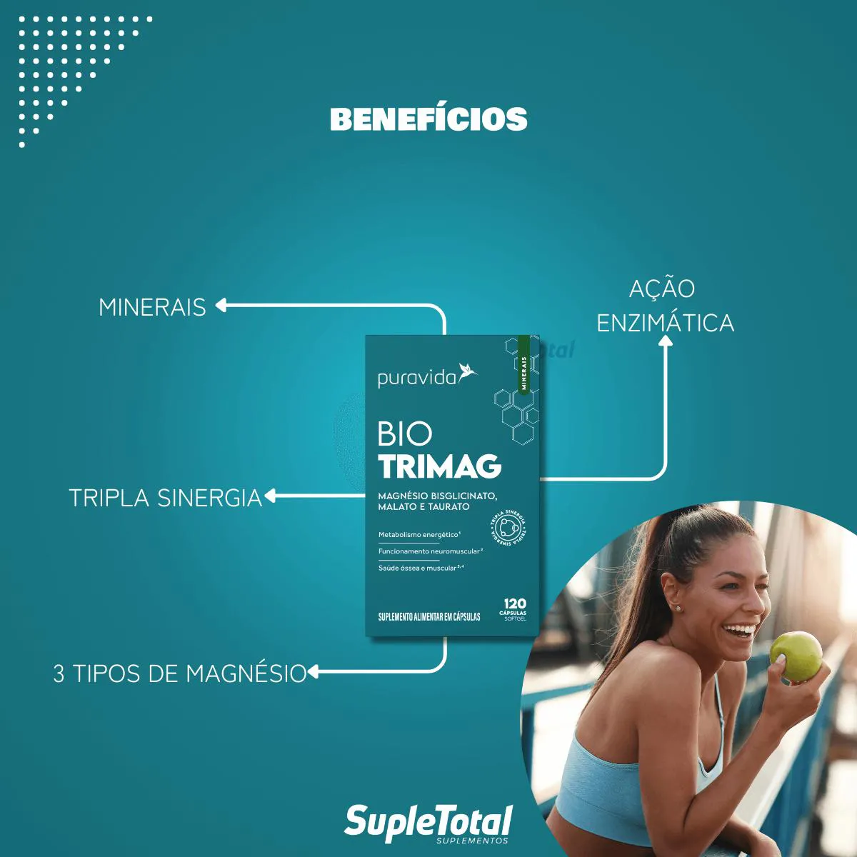 BIO TRIMAG PURAVIDA: UM SUPLEMENTO, 3 BENEFÍCIOS Sempre em busca da inovação e das melhores matérias-primas, desenvolvemos uma fórmula com três tipos de magnésio. MAGNÉSIO MALATO Consiste na combinação de magnésio com ácido málico, um composto orgânico encontrado naturalmente em frutas, como as maçãs. MAGNÉSIO BISGLICINATO Uma das melhores formas para suplementar o magnésio, por isso foi escolhido pela equipe de pesquisadores da Puravida para compor esta tripla sinergia. MAGNÉSIO TAURATO Trata-se da combinação entre magnésio e taurina. A taurina é um aminoácido presente em maior quantidade em alimentos de origem animal, importante em diversas funções no organismo.