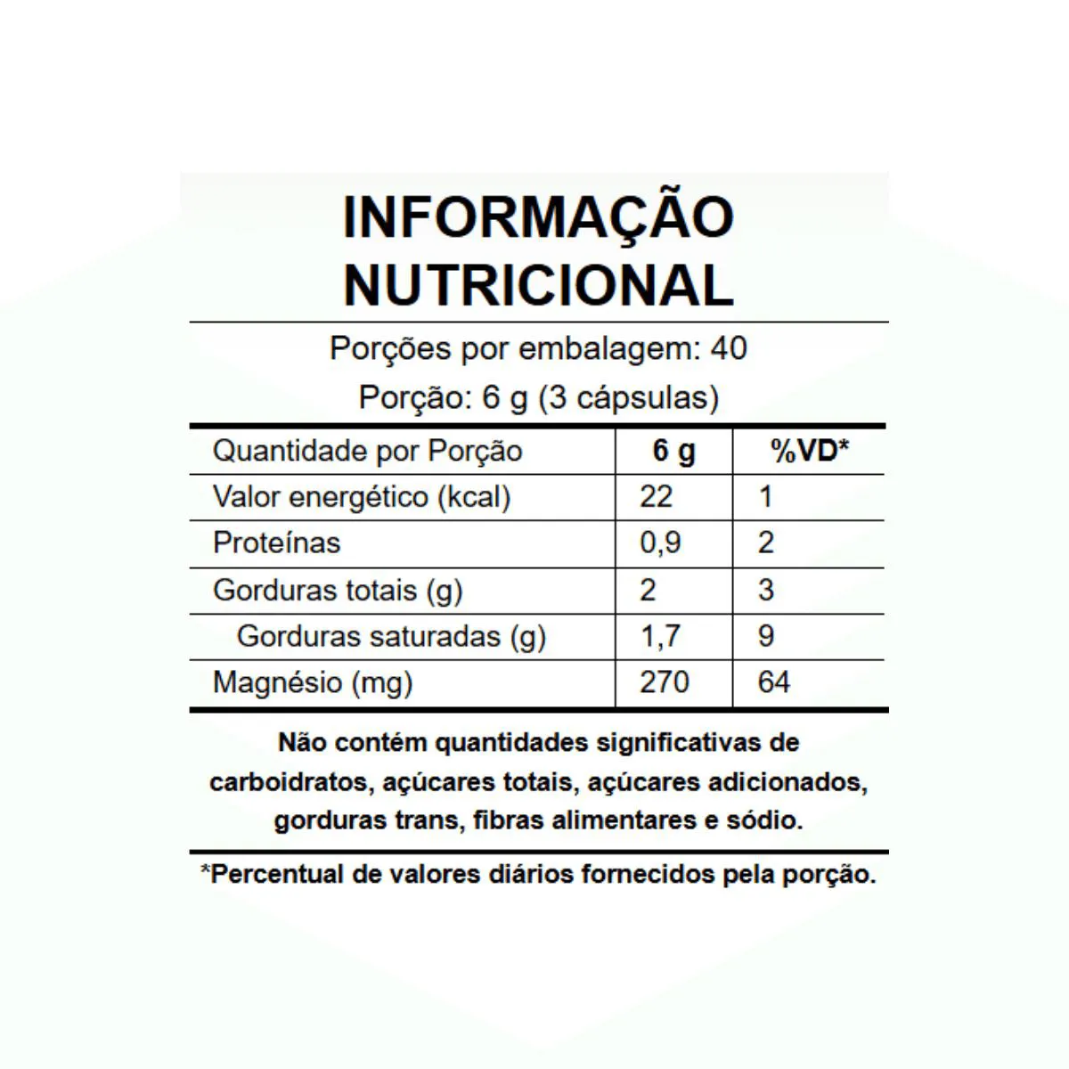 INGREDIENTES: Óleo de coco, cápsula (gelatina, água purificada, umectante glicerina e corante natural clorofilina cúprica), bisglicinato de magnésio, malato de magnésio, taurato de magnésio e emulsificante lecitina de girassol. ALÉRGICOS: pode conter* soja, leite, peixes, ovos, amendoim, amêndoa, nozes, avelãs, pecãs, pistaches, macadâmias, castanha-de-caju, castanha-do-pará, pinoli, castanhas, crustáceos (krill e caranguejo), trigo, centeio, cevada, aveia e suas estirpes hibridizadas. Contém glúten. *Não fazem parte da formulação do produto. No entanto, pode haver traços devido ao compartilhamento de equipamento em alguma etapa do processo produtivo.