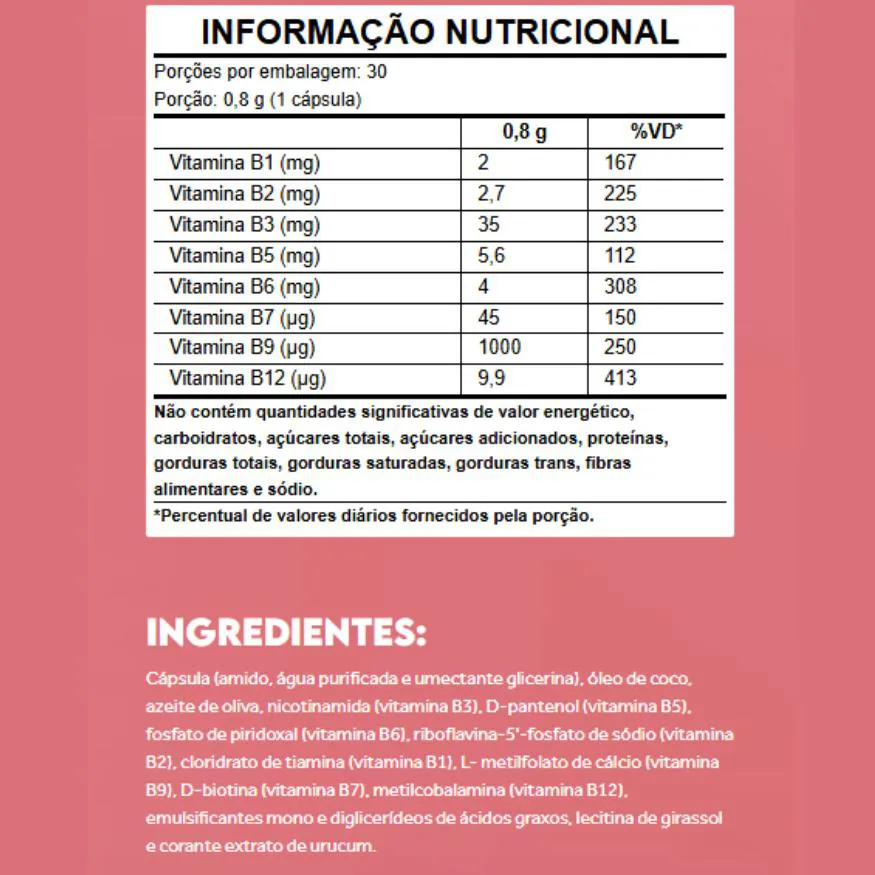 Cápsula (amido, água purificada e umectante glicerina), óleo de coco, azeite de oliva, nicotinamida (vitamina B3), D-pantenol (vitamina B5), fosfato de piridoxal (vitamina B6), riboflavina-5'-fosfato de sódio (vitamina B2), cloridrato de tiamina (vitamina B1), L-metilfolato de cálcio (vitamina B9), D-biotina (vitamina B7), metilcobalamina (vitamina B12), emulsificantes mono e diglicerídeos de ácidos graxos, lecitina de girassol e corante extrato de urucum.