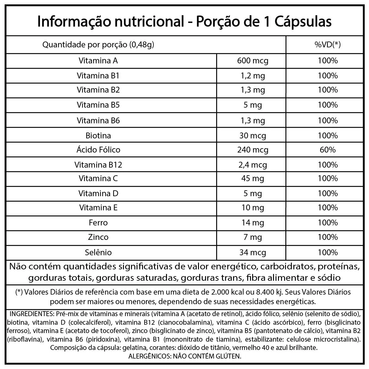 INGREDIENTES: Pré-mix de vitaminas e minerais , ácido fólico, selênio , biotina, vitamina d , vitamina B12 , vitamina c , ferro , vitamina e , zinco , vitamina B5 , vitamina B2 , vitamina B6 , vitamina B1 , estabilizante: celulose microcristalina). Composição da cápsula: gelatina, corantes: dióxido de titânio, vermelho 40 e azul brilhante.