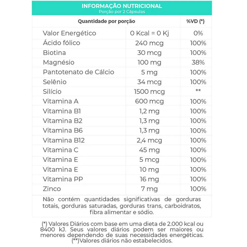 Magnésio, Ácido Ascórbico, Niacina, Alfa Tocoferol, Zinco, Pantotenato de Cálcio, Cloridrato de Piridoxina, Riboflavina, Tiamina, Retinol, Ácido fólico, Selênio,Silício Orgânico, Biotina (Vitamina H), Vitamina D3, Cianocobalamina, antiumectante Dióxido de Silício, Fosfato de cálcio Tribásico, Estearato de Magnésio. Cápsulas: HPMC e água, corante purple carrot e spirulina.
