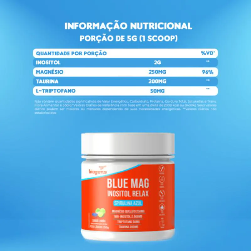 Blue Mag Biogens é um suplemento inigualável para sua rotina noturna pré-sono. Prática, rápida, deliciosa e excêntrica. Se trata de uma bebida solúvel, com um gostinho de limão, que contém grande riqueza nutricional e uma cor exuberante: um vibrante tom de azul! É tão azul quanto as águas alcalinas dos lagos onde crescem as micro-algas que dão origem à Spirulina do Blue Mag Biogens. E o melhor de tudo: oferece um aporte de micronutrientes completo e biodisponível. Composto pela Spirulina Azul, Mio-Inositol, Magnésio Quelato, Triptofano e Taurina. Além disso, Blue Mag Biogens pode ser misturado em bebidas quentes ou frias, desde água a leite, de acordo com a sua preferência!