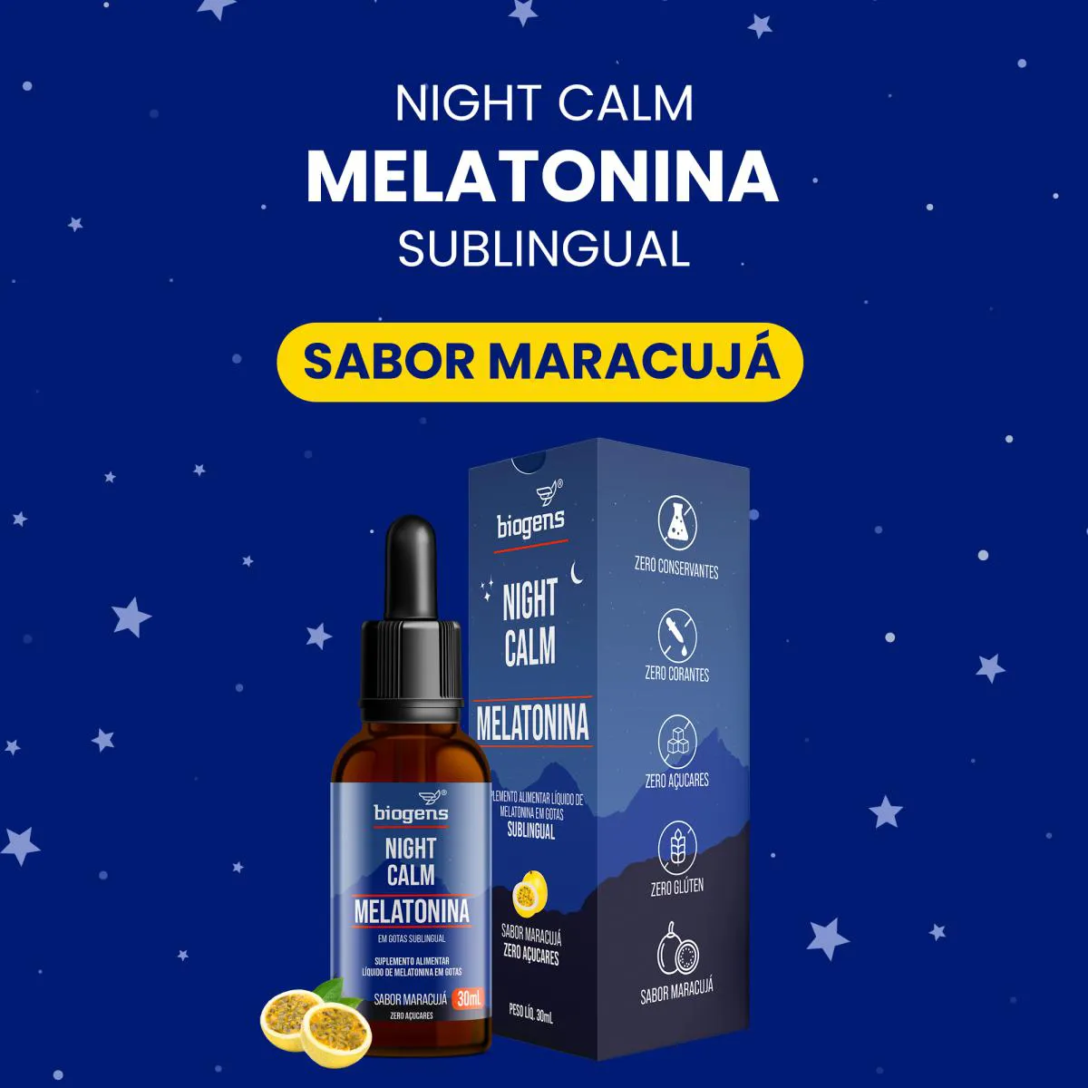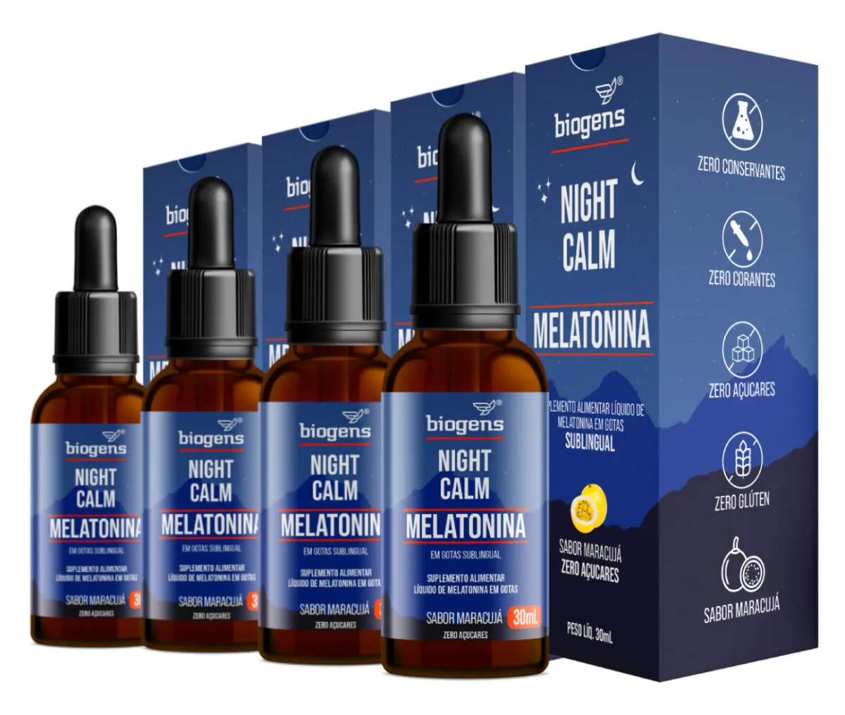 O Night Calm da Biogens traz a melatonina em sua forma líquida e com leve sabor de maracujá ou menta. É de uso sublingual (administrado debaixo da língua), a forma de maior biodisponibilidade e mais rápida de absorção pelo organismo, comparativamente aos comprimidos ingeridos por via oral. A melatonina é um hormônio produzido naturalmente pelo nosso organismo, mais precisamente na glândula pineal, que fica no nosso cérebro. Ela é liberada no início da noite, quando cai a iluminação natural, porém tem um pico de produção maior algumas horas após o anoitecer, sendo assim o hormônio que atua no estabelecimento do chamado ritmo circadiano, que é o relógio biológico do organismo.