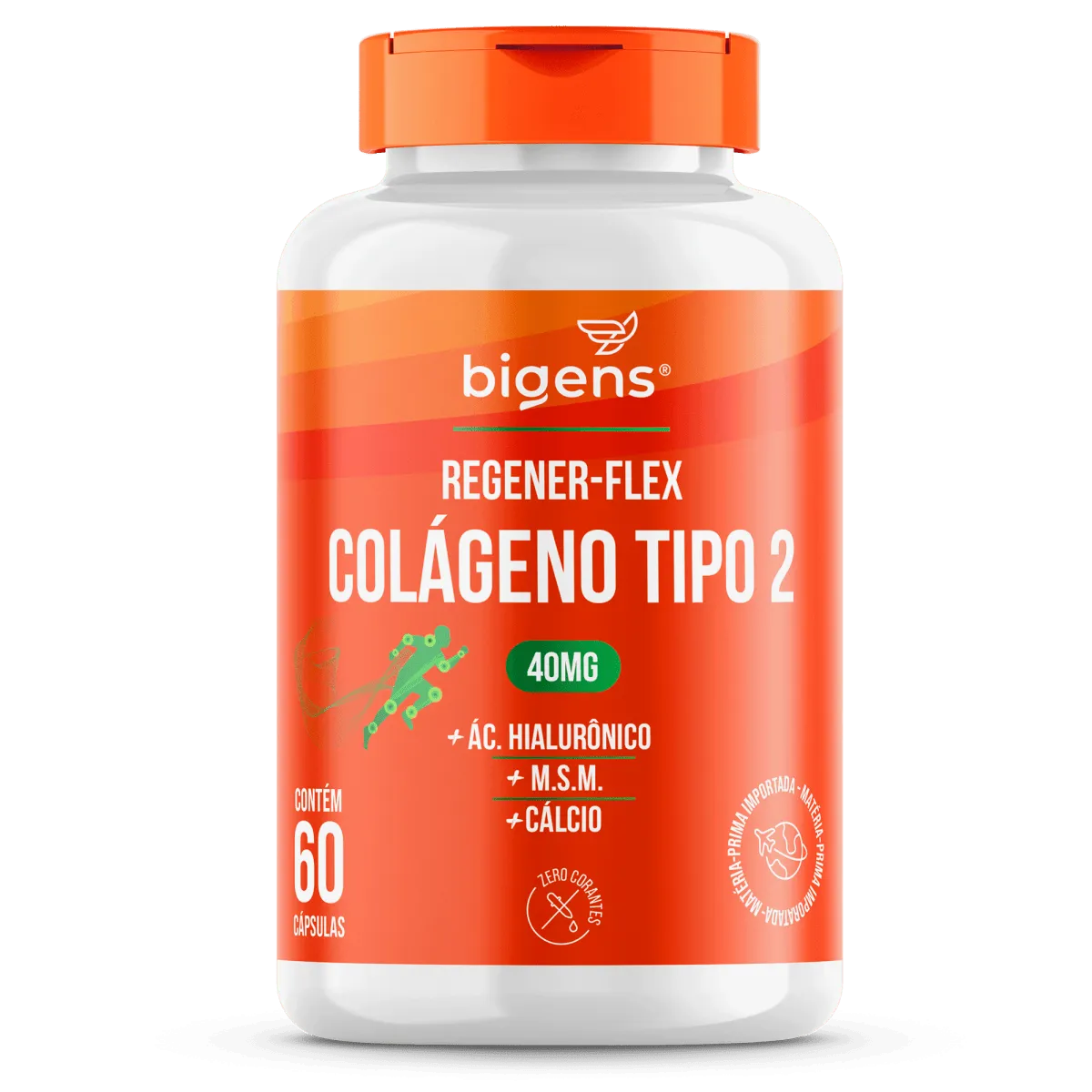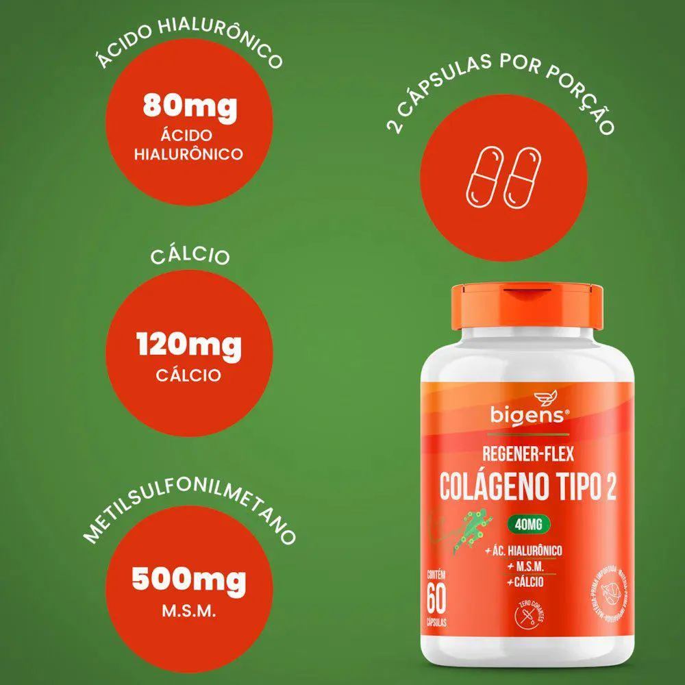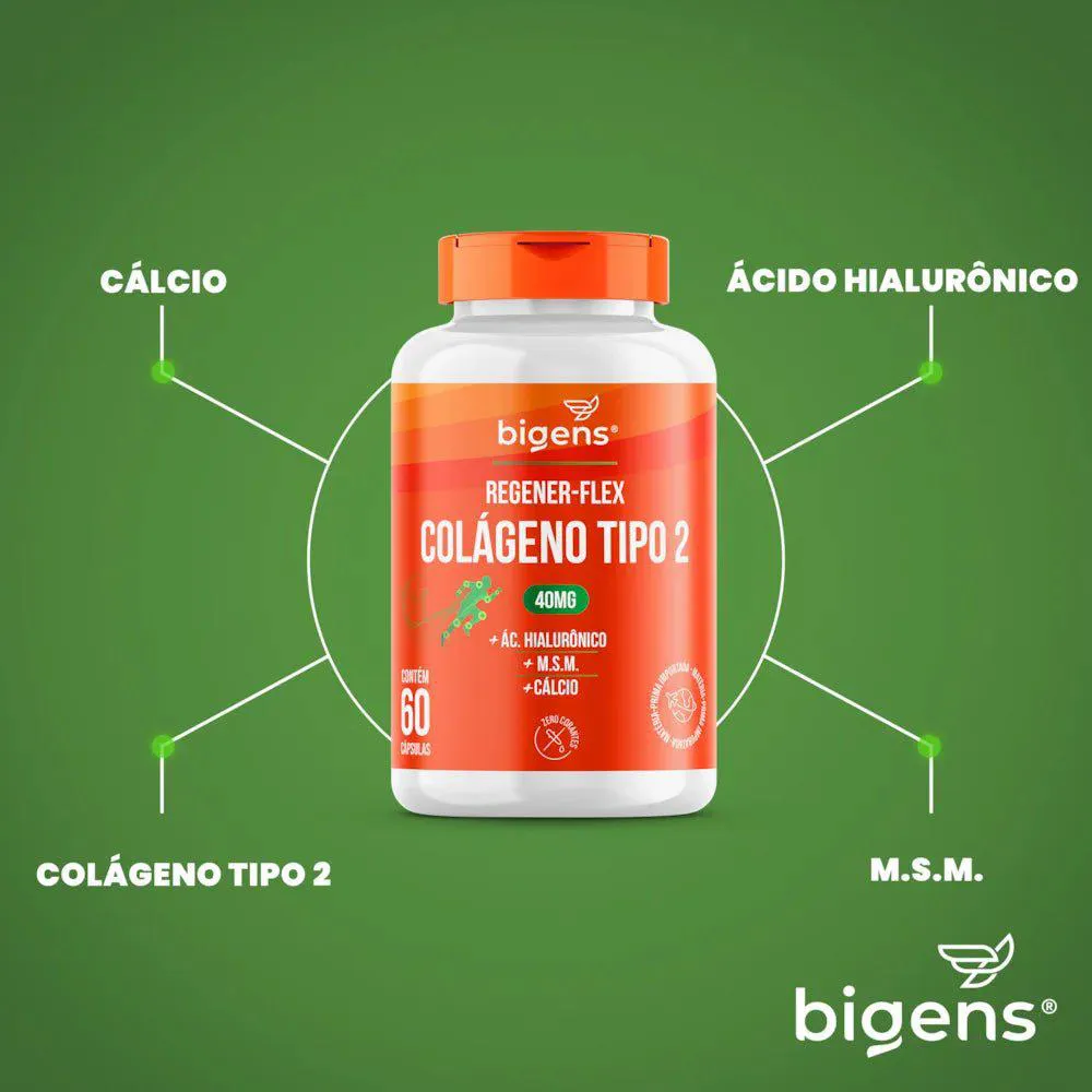 Regener Flex, Colágeno tipo 2 40mg, ácido hialurônico, M.S.M., Cálcio, 60 Cápsulas, Bigens