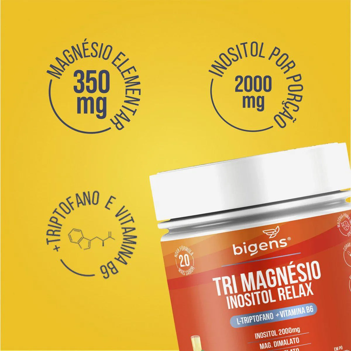 TRI MAGNÉSIO INOSITOL RELAX L-TRIPTOFANO + VITAMINA B6 + MAGNÉSIOS DIMALATO, QUELATO E TAURATO 180 GRAMAS Trimagnésio Inositol Relax Biogens é um suplemento formulado para uma excelente absorção no organismo. Tem em sua composição L-Triptofano, Inositol e Vitamina B6 além das 3 formas especiais de magnésio, sendo estes, Magnésio Dimalato que vem da associação a duas moléculas de ácido málico, Magnésio Quelato ou Bisglicinato vem da associação a duas moléculas de aminoácidos glicina e o Magnésio Taurato que vem da associação ao aminoácido de taurina. Essas associações tornam o mineral biodisponível e atuam diretamente no aumento da velocidade de absorção.