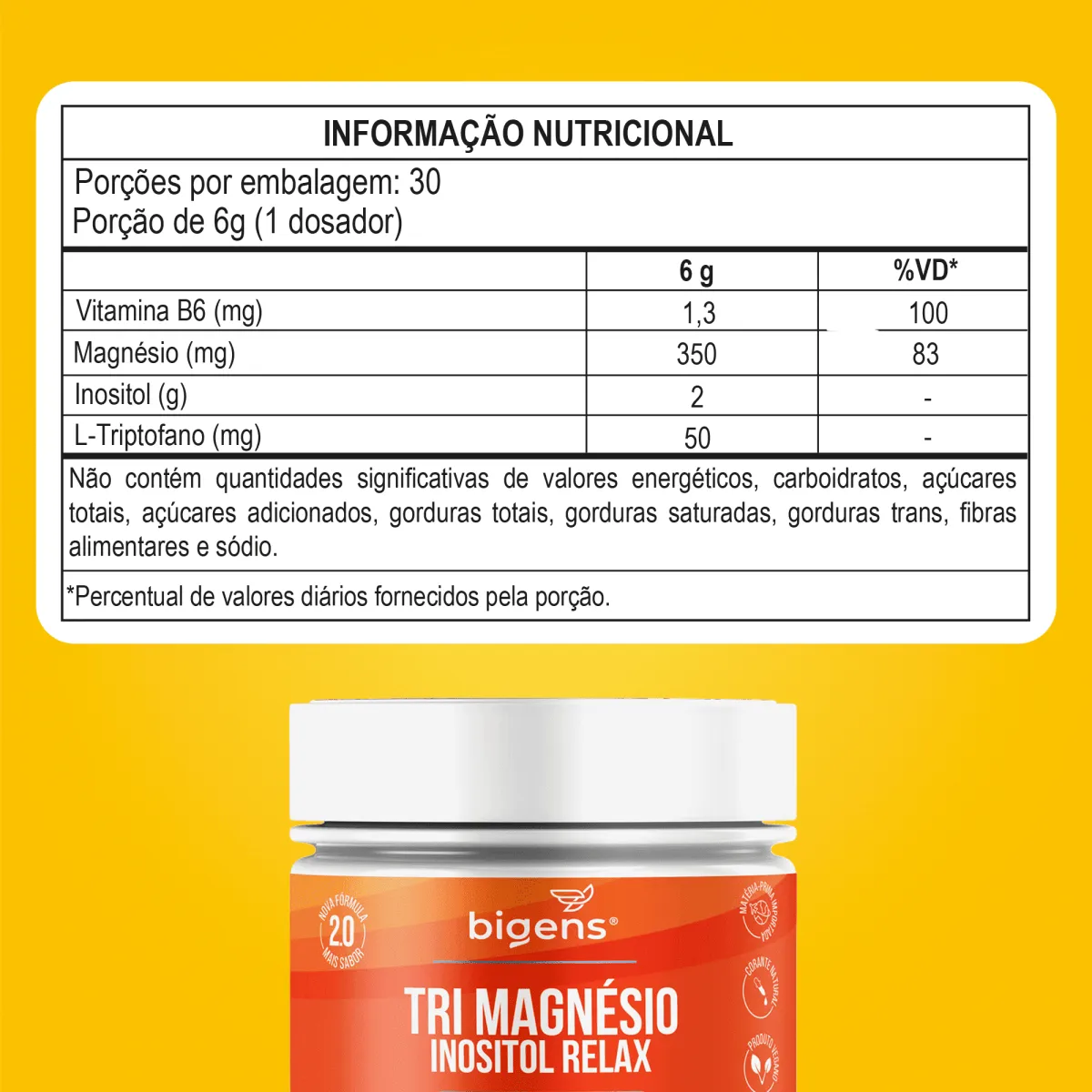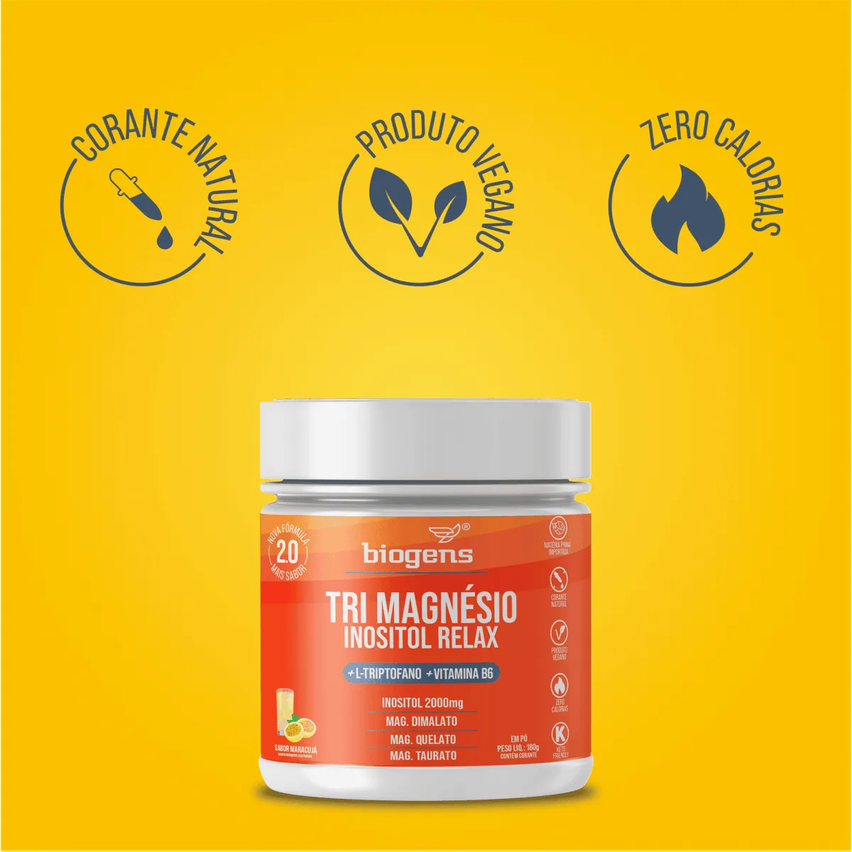 INGREDIENTES: Inositol (Mio-inositol), Dimagnésio Malato, Bisglicinato de Magnésio, Taurato de Magnésio, L-Triptofano, Cloridrato de Piridoxina (Vitamina B6), Polpa de Maracujá, Acidulante Ácido Cítrico, Aromatizante, Edulcorante Glicosídeos de esteviol, Corante Natural Cúrcuma e Antiumectante Dióxido de Silício. NÃO CONTÉM GLÚTEN ALÉRGICOS: Pode Conter Castanha de Caju. SUGESTÃO DE USO: Adultos 19 anos, consumir 1 scoop ao dia, diluído em 150ml de água ou a bebida de sua preferência, ou conforme a orientação de médico ou nutricionista. Conservar este produto bem fechado, em lugar fresco, seco e ao abrigo da luz. Após aberto consumir em até 90 dias.