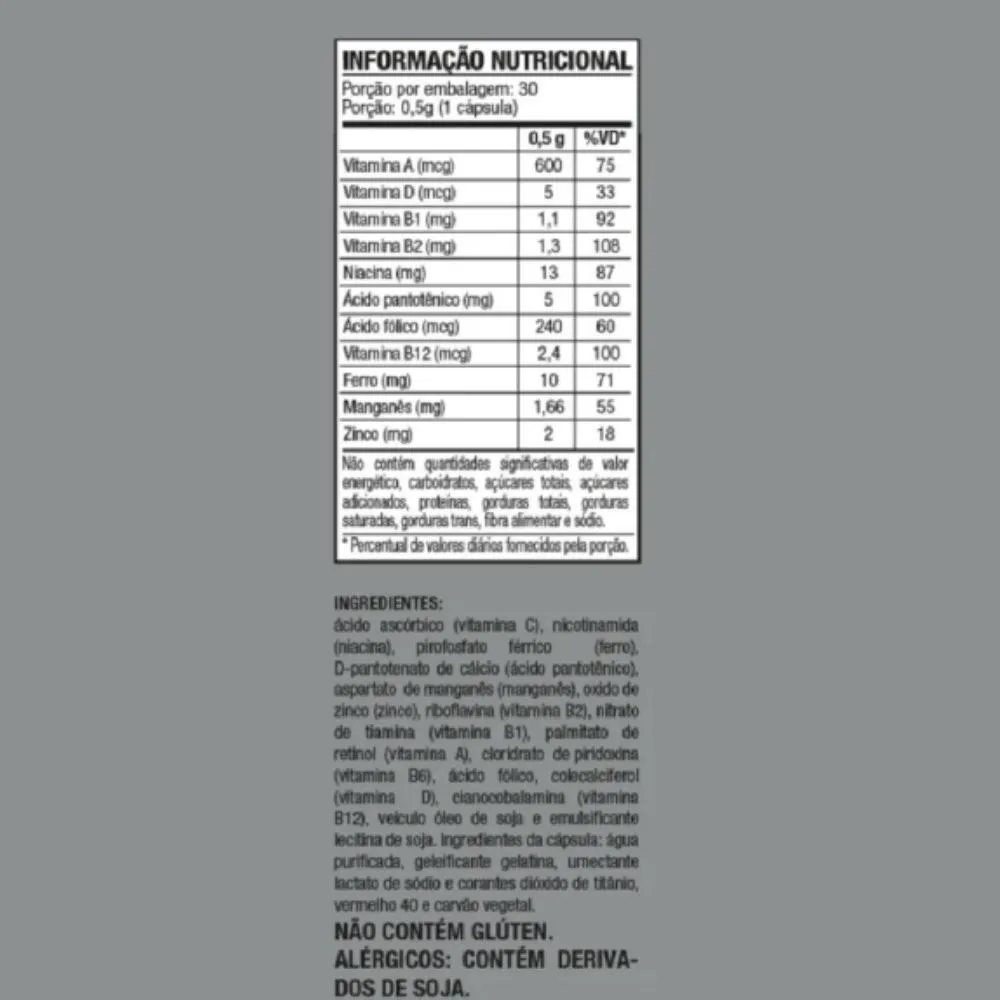 Ingredientes: Ácido ascórbico (vitamina C), nicotinamida (niacina), pirofosfato férrico (ferro), D-pantotenato de cálcio (ácido pantotênico), aspartato de manganês (manganês), óxido de zinco (zinco), riboflavina (vitamina B2), nitrato de tiamina (vitamina B1), palmitato de retinol (vitamina A), cloridrato de piridoxina (vitamina B6), ácido fólico, colecalciferol (vitamina D), cianocobalamina (vitamina B12), veículo óleo de soja e emulsificante lecitina de soja. Ingredientes da cápsula: água purificada, gelificante gelatina, umectante lactato de sódio e corantes dióxido de titânio, vermelho 40 e carvão vegetal. Não contém glúten. Alérgicos: contém derivados de soja.