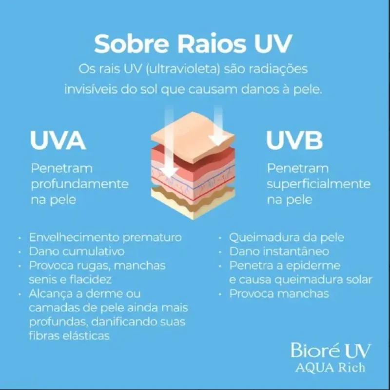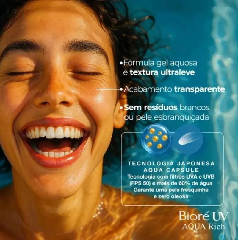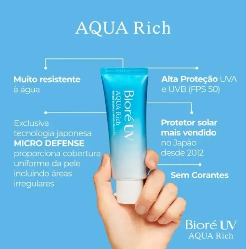 Bioré, a marca Nº 1 em proteção solar no Japão, apresenta Aqua Rich. O protetor solar facial e corporal Aqua Rich Watery Essence com alta proteção UVA e UVB (FPS 50) oferece alta proteção solar de forma leve e fresca, sem pesar. Com sua textura gel aquosa incrivelmente leve e acabamento transparente, não deixa a pele esbranquiçada, oleosa ou pegajosa e é rapidamente absorvido. Graças a sua exclusiva tecnologia MICRO DEFENSE proporciona cobertura uniforme da pele incluindo áreas irregulares.
