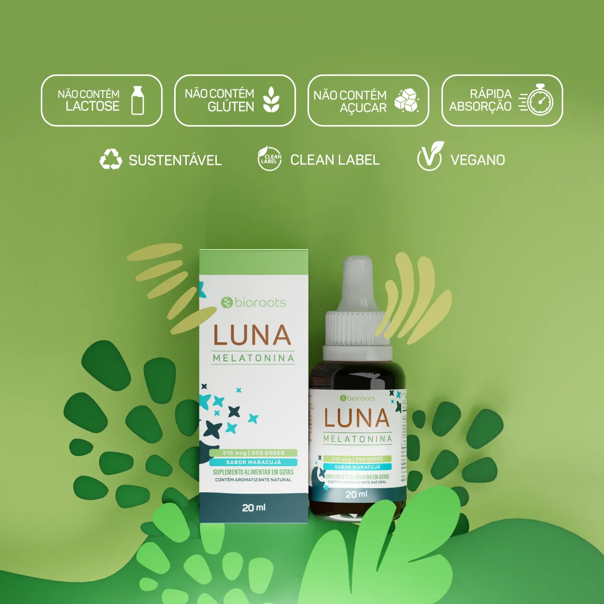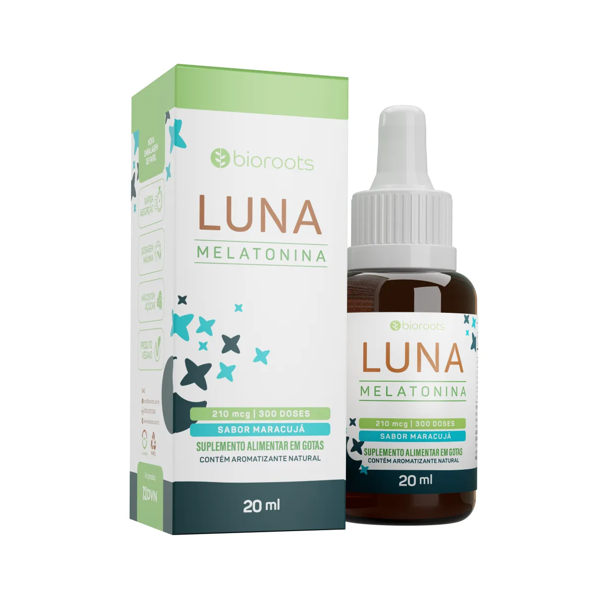 Bioroots Luna é um suplemento alimentar de melatonina em gotas sabor maracujá.