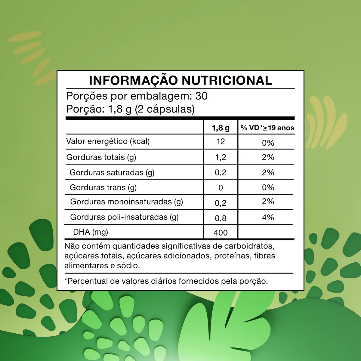 Microalgas Schizochytrium sp. com ácido docosahexaenóico (DHA), glaceante etilcelulose, estabilizante hidroxipropilmetilcelulose, lubrificante estearato de magnésio, antiumectante dióxido de silício e agente de massa celulose microcristalina.
