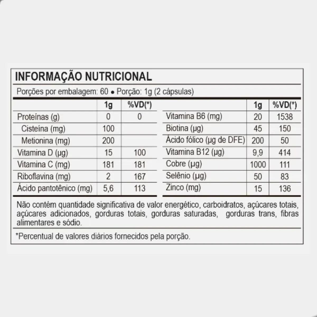 - Fórmula enriquecida com zinco, selênio e vitaminas do complexo B.