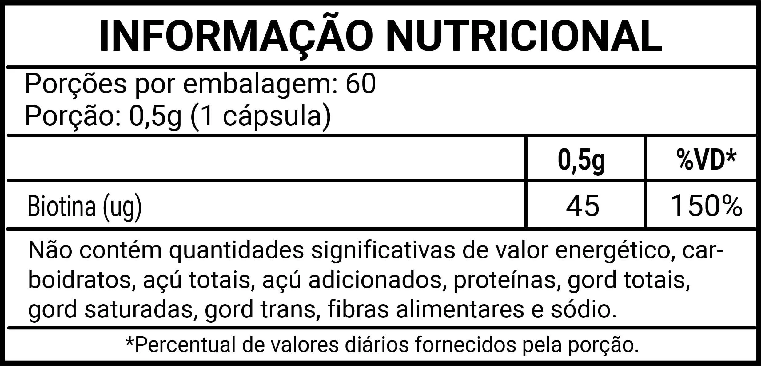 D-Biotina, antiumectantes, silicato de magnésio, dióxido de silício. Composição da cápsula: gelatina, dióxido de titânio, eritrosina, azul brilhante FCF.
