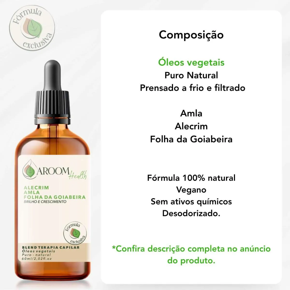 Revitalize seus cabelos com nosso Blend exclusivo de óleos vegetais puros naturais desodorizado, prensado a frio e filtrado . Fórmula cuidadosamente elaborada que combina os óleos de Alecrim, Amla e Folha da Goiabeira, proporcionando crescimento capilar, nutrição profunda , fortalecimento dos fios .