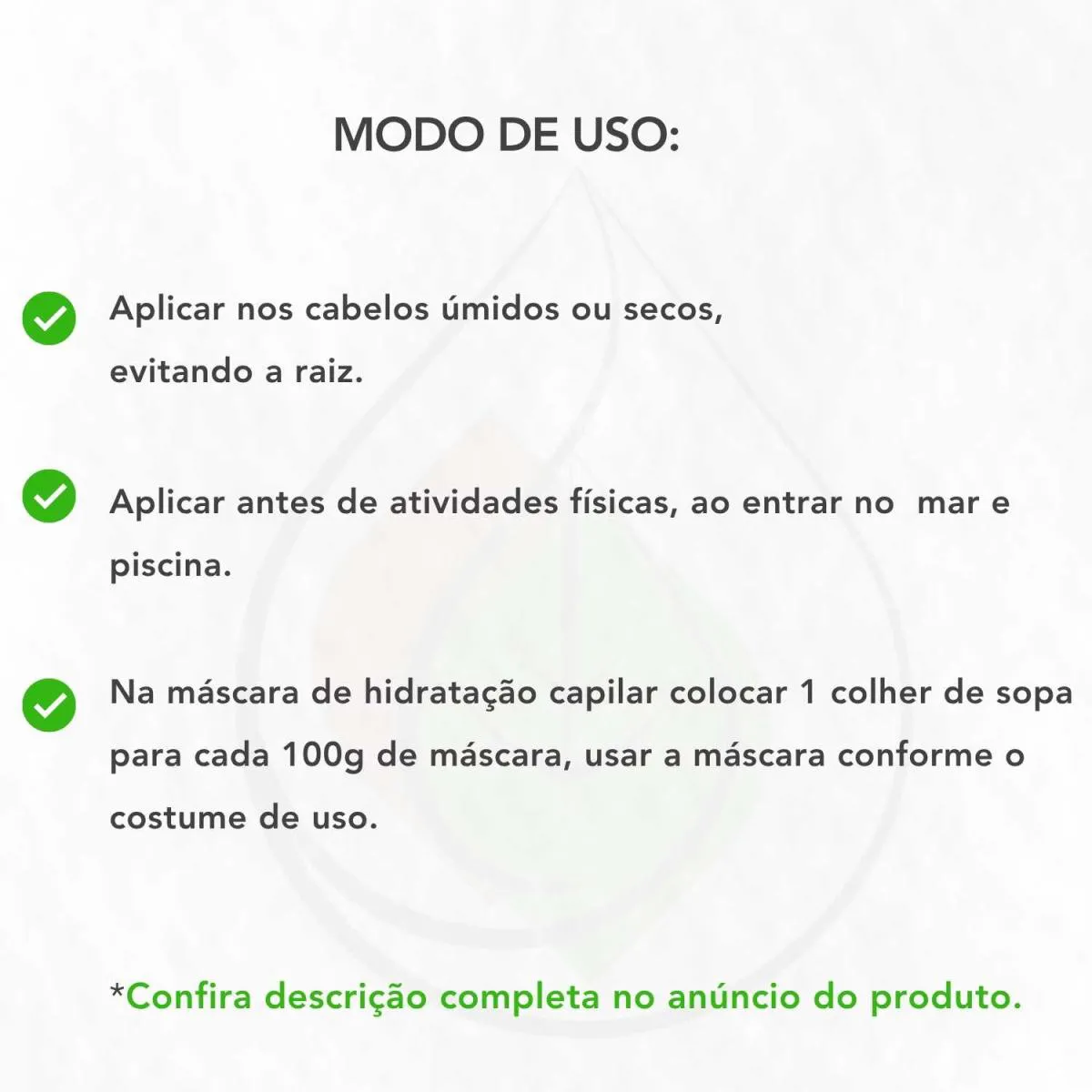 Blend de óleos Reparador de Pontas 50 ml – Fórmula Exclusiva AroomHeath Transforme seus cabelos com nosso Blend exclusivo de óleos vegetais e essenciais puro natural, especialmente formulado para reparar e nutrir as pontas. Com ingredientes naturais como óleo de Açaí e Argan, aliados aos óleos essenciais de Gerânio e Palmarosa, este produto oferece uma ação profunda que revitaliza os fios. Nutrição intensa e regeneração das pontas ressecadas - Controle eficaz do frizz - Brilho e maciez duradouros - Combate pontas duplas. Ideal para quem deseja cabelos hidratados, saudáveis e com aspecto renovado. Produto de alta qualidade, livre de componentes químicos, garantindo cuidado capilar saudável. Pode ser usado por todos os tipos de cabelo. Modo de uso: Aplicar no cabelos umido ou seco, evitando a raiz do cabelo. Excelente usar antes de atividades físicas ao entrar no mar e piscina. Características do Produto: Produto vegano, sem testes em animais. Embalagem em vidro âmbar com conta-gotas. Validade de 2 anos (verifique no rótulo). Precauções: Armazene em local fresco, longe da luz e fora do alcance de crianças e animais. Gestantes e lactantes consultar médico antes do uso. Havendo sensibilidade ao produto, suspender o uso. USO EXTERNO.
