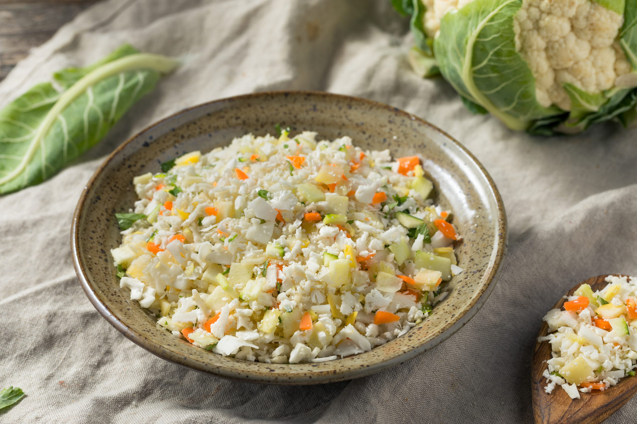 Primeiramente, triture os floretes em um processador de alimentos até obter pequenos pedaços, como grãos de arroz. Em seguida, transfira a couve-flor triturada para um pano de cozinha fino e esprema bem para retirar o excesso de água.