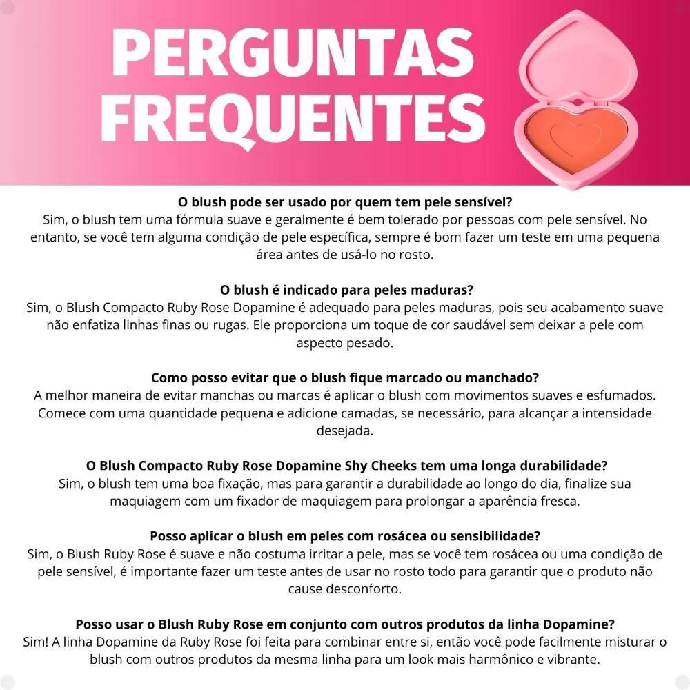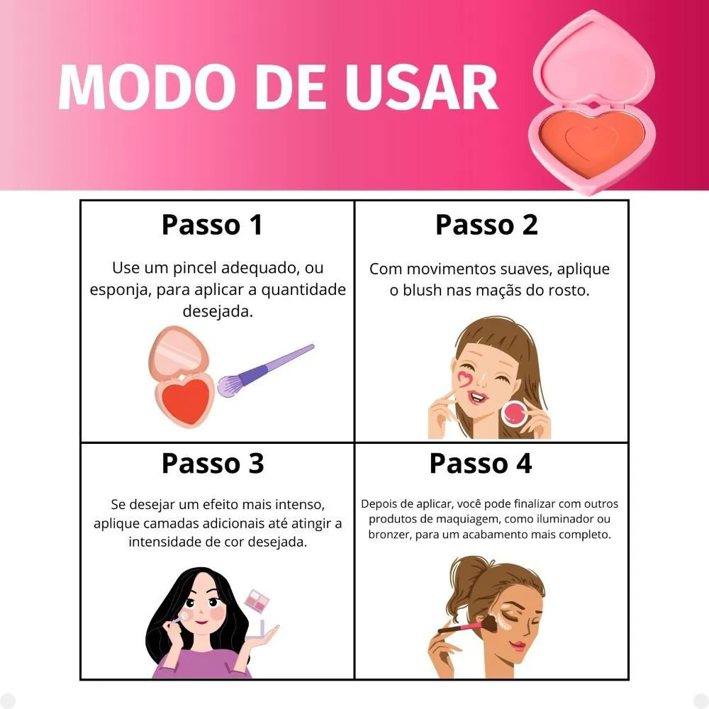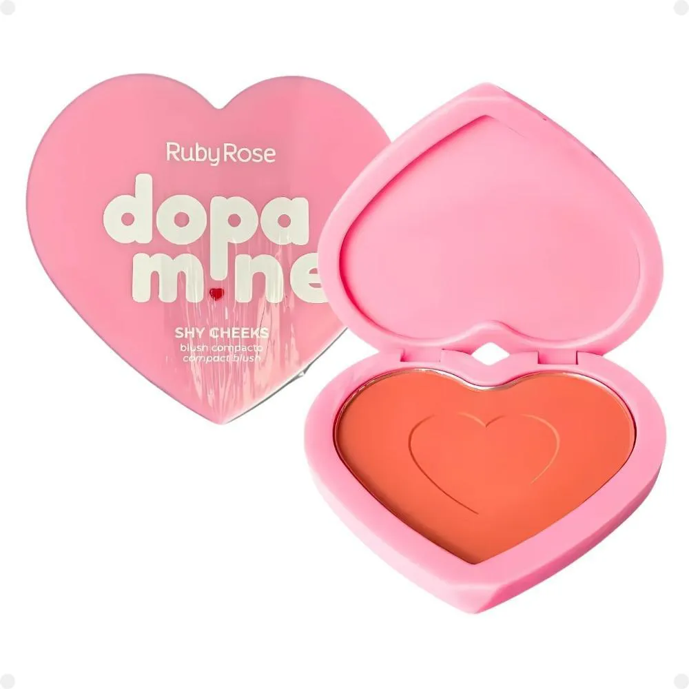 blush Compacto Ruby Rose Dopamine Shy Cheeks Coral Affair Hb-F1002-4 Com um encantador formato de coração, este Blush é a escolha ideal para quem busca um toque romântico e saudável na maquiagem. Sua fórmula leve e fácil de aplicar proporciona uma textura macia e pigmentação intensa, permitindo uma aplicação suave e uniforme. Seja para um encontro especial ou para o dia a dia, o Dopamine Shy Cheeks traz um efeito deslumbrante que ilumina sua beleza natural, realçando a beleza da pele sem excessos. . Modo de Uso Com movimentos suaves, aplique o blush nas maçãs do rosto, esfumando para as têmporas para um efeito mais natural e saudável. Aplique sempre aos poucos e vá construindo a intensidade para garantir um acabamento natural e bem-esfumado! Se desejar um efeito mais intenso, aplique camadas adicionais até atingir a intensidade de cor desejada. Lembre-se de evitar excesso. Depois de aplicar, você pode finalizar com outros produtos de maquiagem, como iluminador ou bronzer, para um acabamento mais completo. . Composição Talc, Mica, Magnesium Stearate,, Polyethylene, Isononyl Isononanoate, Silica, Titanium/Titanium Dioxide, Rose Flower Oil, Acetyl Cedrene, Benzyl Acetate, Citrus Aurantium Bergamia Fruit Oil, Anisaldehyde, Cananga Odorata Leaf Oil, Phenoxyethanol. Pode Conter: CI 15850, CI 77491, CI 77492, Tin Oxide, CI77499, Synthetic Fluorphlogopite, CI 12370, Formaldehyde/Melamine/Tosylamide, Copolymer,CI 45410. Perguntas Frequentes O blush pode ser usado por quem tem pele sensível? Sim, o blush tem uma fórmula suave e geralmente é bem tolerado por pessoas com pele sensível. No entanto, se você tem alguma condição de pele específica, sempre é bom fazer um teste em uma pequena área antes de usá-lo no rosto. O blush é indicado para peles maduras? Sim, o Blush Compacto Ruby Rose Dopamine é adequado para peles maduras, pois seu acabamento suave não enfatiza linhas finas ou rugas. Ele proporciona um toque de cor saudável sem deixar a pele com aspecto pesado. Como posso evitar que o blush fique marcado ou manchado? A melhor maneira de evitar manchas ou marcas é aplicar o blush com movimentos suaves e esfumados. Comece com uma quantidade pequena e adicione camadas, se necessário, para alcançar a intensidade desejada. O Blush Compacto Ruby Rose Dopamine Shy Cheeks tem uma longa durabilidade? Sim, o blush tem uma boa fixação, mas para garantir a durabilidade ao longo do dia, finalize sua maquiagem com um fixador de maquiagem para prolongar a aparência fresca. Posso aplicar o blush em peles com rosácea ou sensibilidade? Sim, o Blush Ruby Rose é suave e não costuma irritar a pele, mas se você tem rosácea ou uma condição de pele sensível, é importante fazer um teste antes de usar no rosto todo para garantir que o produto não cause desconforto. . Código de Registro Sanitário (ANVISA) 25351.353937/2024-10 .