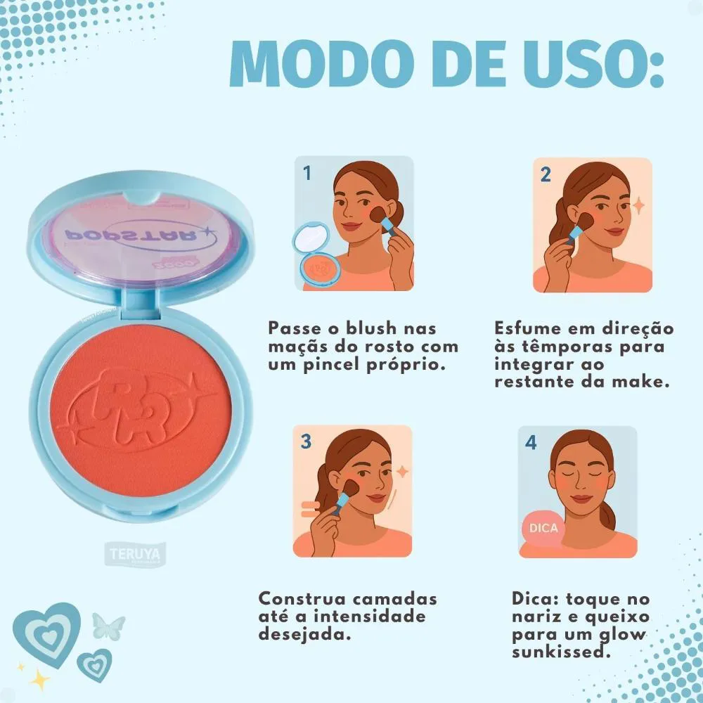 Aplique o Blush Compacto Ruby Rose Popstar Play Back Summer HB-M08-3 com o auxílio de um pincel de maquiagem nas maçãs do rosto, espalhando suavemente em direção às têmporas, até adquirir a intensidade de cor desejada.Para um efeito mais natural, utilize um pincel macio e esfume bem as bordas do blush, evitando marcações.
