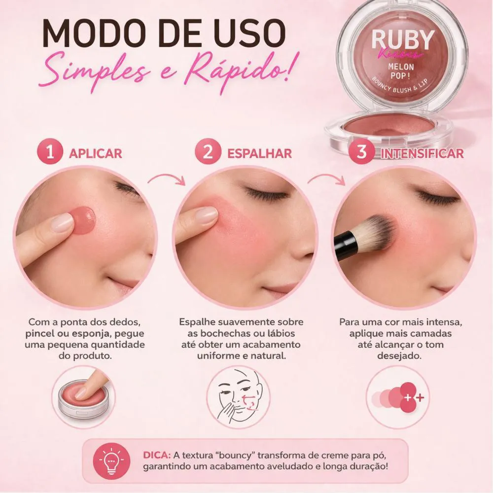 O Blush e Lip Bouncy Ruby Kisses Melon Pop! é perfeito para o dia a dia, adicionando um toque de cor natural e saudável. É ideal para criar looks rápidos e práticos, seja para o trabalho, encontros casuais ou eventos especiais. Sua longa duração o torna um aliado para qualquer ocasião, mantendo sua maquiagem impecável por mais tempo.Modo de Uso/Aplicação