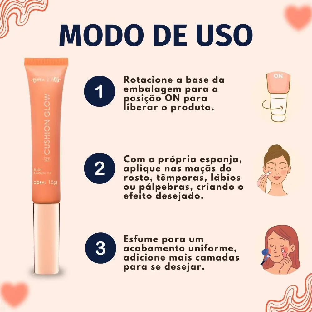 Modo de Uso/Aplicação Para iniciar o uso, gire a embalagem na posição ON. Aperte suavemente o corpo do produto até que o blush comece a sair na esponja aplicadora. Aplique diretamente nas áreas desejadas do rosto, como maçãs, têmporas, ou até mesmo nos lábios e pálpebras para um toque de cor e brilho. Após o uso, gire a embalagem para a posição OFF para garantir o fechamento e a conservação do produto.
