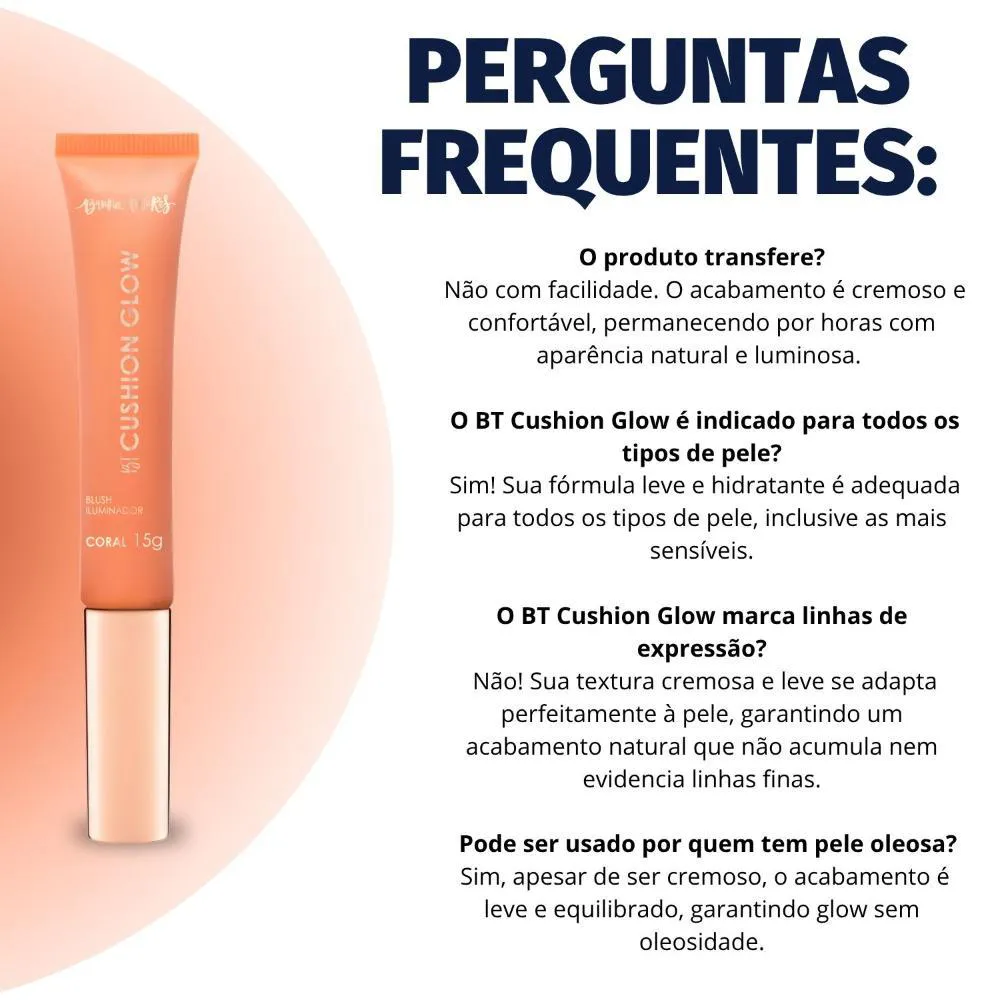 Ocasiões de Uso/Cenários Ideais O Blush Iluminador Bruna Tavares Bt Cushion Glow Coral é perfeito para diversas situações, desde a maquiagem do dia a dia, para um visual fresco e natural, até eventos especiais, onde um toque de luminosidade e cor faz toda a diferença. Ideal para quem busca realçar a beleza com um aspecto de pele saudável e radiante, e para os amantes de produtos multifuncionais que otimizam a rotina de beleza.