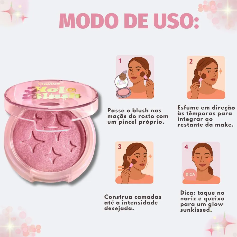 O Blush Iluminador Holográfico Dailus Holo Blush Rosé é perfeito para diversas ocasiões, desde o dia a dia, adicionando um toque de luminosidade sutil, até eventos especiais, onde um brilho mais intenso é desejado. Ideal para quem busca realçar as maçãs do rosto e criar um visual radiante e moderno. Use-o em festas, encontros, baladas, ou sempre que quiser se sentir mais confiante e iluminada. Ele também é uma ótima opção para presentear aquela pessoa especial que adora maquiagem e brilho.Modo de Uso/Aplicação