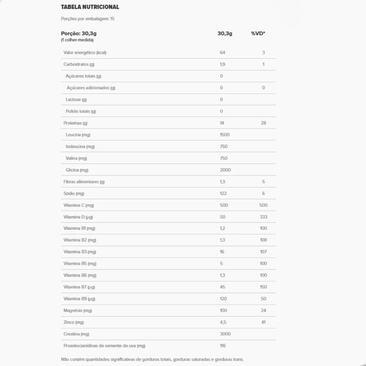 A formulação utiliza peptídeos de colágeno obtidos por hidrólise, proteínas isoladas e concentradas, além de vitaminas e minerais que contribuem para o equilíbrio nutricional. Não contém açúcar refinado, glúten ou ingredientes artificiais, priorizando matérias-primas certificadas.
