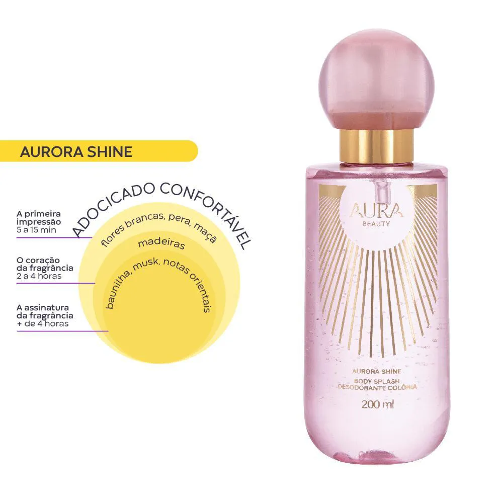 Aurora Shine Body Splash da Hinode é uma fragrância feminina radiante, inspirada na força, beleza e energia de uma deusa. Desenvolvido para mulheres que desejam se sentir confiantes, encantadoras e iluminadas, esse body splash entrega uma experiência olfativa envolvente e reconfortante, ideal para o dia a dia.Com um sol olfativo Adocicado Confortável, a fragrância se abre com a leveza das flores brancas, combinadas à suculência da pêra e da maçã, revelando um frescor elegante e feminino. O corpo amadeirado adiciona profundidade e mistério à composição, enquanto o fundo mistura a doçura da baunilha, a cremosidade do musk e o toque marcante do acorde oriental, resultando em um rastro sensual e inesquecível.Sinta-se no Olimpo todos os dias com uma fragrância digna de uma deusa.Sol Olfativo: Adocicado ConfortávelNotas Olfativas: