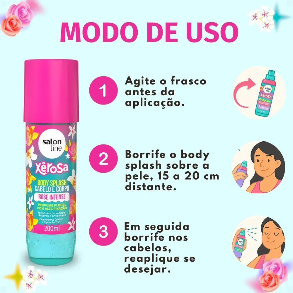 Aplicar o Body Splash Cabelo E Corpo Salon Line Xêrosa Rose Intense sobre o cabelo e o corpo conforme desejado, espalhando suavemente para uma perfumação uniforme.Anvisa: 25351.117671/2025-16