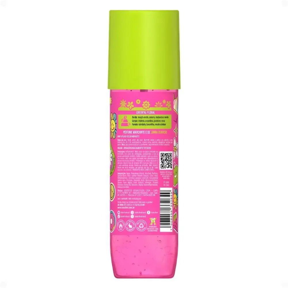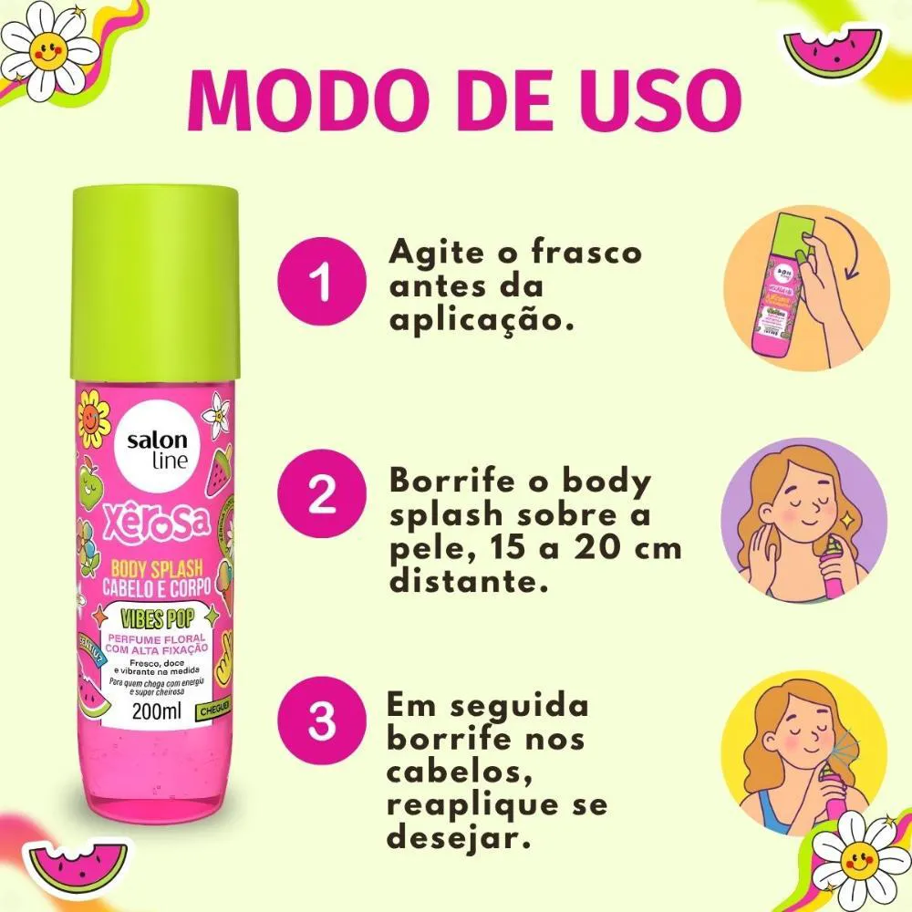 O Body Splash Xêrosa Vibes Pop é perfeito para ser usado em qualquer momento do dia, seja para iniciar a manhã com uma sensação de frescor, para um retoque rápido após a academia, ou para prolongar a sensação de banho tomado. Sua versatilidade permite que seja aplicado tanto no corpo quanto nos cabelos, tornando-o um item essencial para quem busca praticidade e um aroma agradável em todas as ocasiões.Modo de Uso/Aplicação