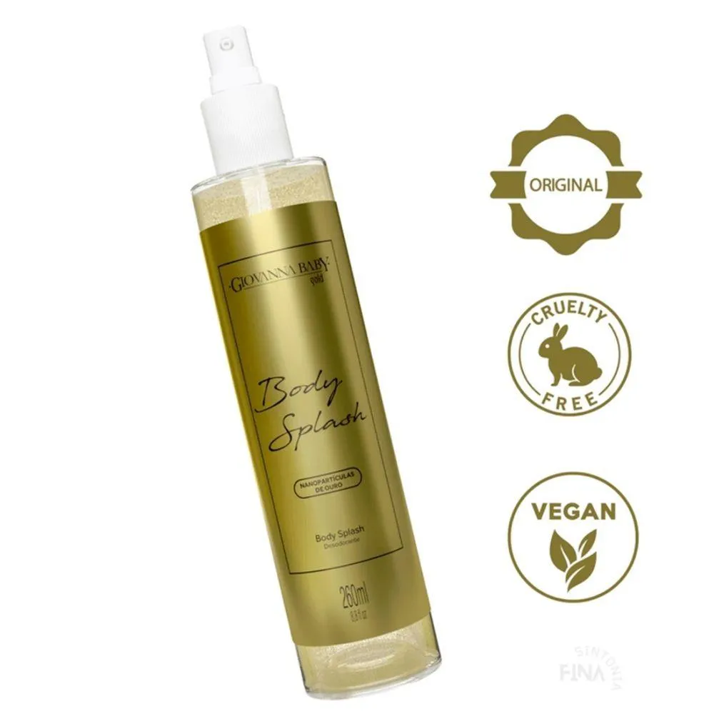 Elaborada com nanopartículas de ouro, a Body Splash GOLD reúne propriedades estimulantes, revitalizantes e iluminadoras, proporcionando um irresistível aspecto dourado à pele, com efeito iluminador. O mix olfativo provoca uma experiência sensorial única, mesclando notas frutais de amora, bergamota e pera com acordes de cassis, chantilly, baunilha e marshmallow, transformando os sabores de nossa memória afetiva em uma fragrância suculenta e revigorante. A madeira de cashmere empresta uma tonalidade aveludada, moderna e ousada à composição. Leve e reluzente, pode ser reaplicada a qualquer momento do dia. Dermatologicamente testado.
