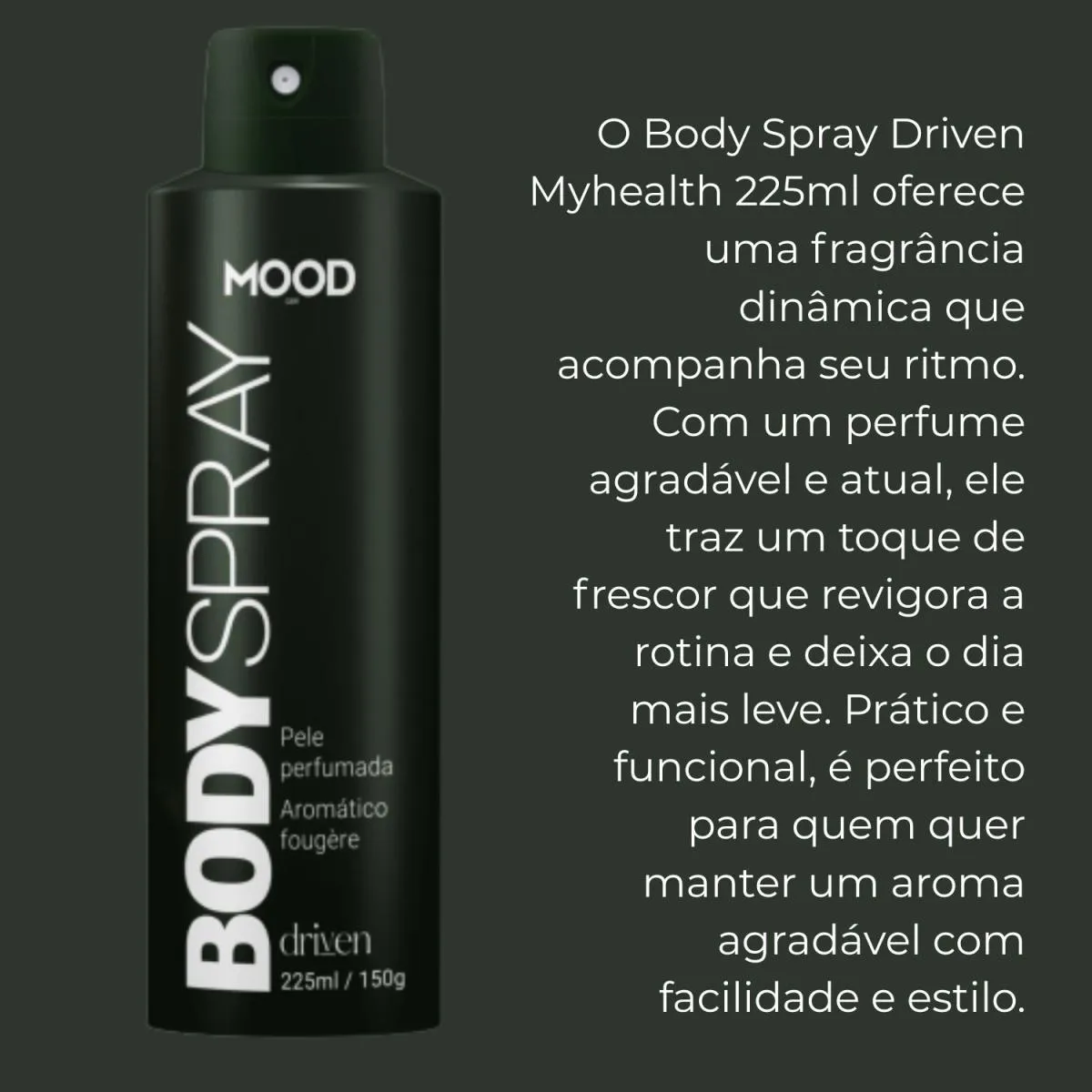 Body spray Mood Myhealth 225 ml Driven O Body Spray Mood Myhealth 225 ml Driven é um spray corporal masculino pensado para quem busca uma fragrância marcante e duradoura, ideal para o dia a dia — seja após o banho, no trabalho ou em momentos de lazer. Diferenciais · Fragrância masculina com perfil moderno e envolvente. · Embalagem de 225 ml, oferecendo várias aplicações e ótimo custo-benefício. · Aplicação prática em spray, facilitando o uso rápido e uniforme no corpo ou nas roupas. · Pode ser usado sozinho ou combinado com desodorantes/colônias para reforçar e prolongar o perfume. Modo de uso